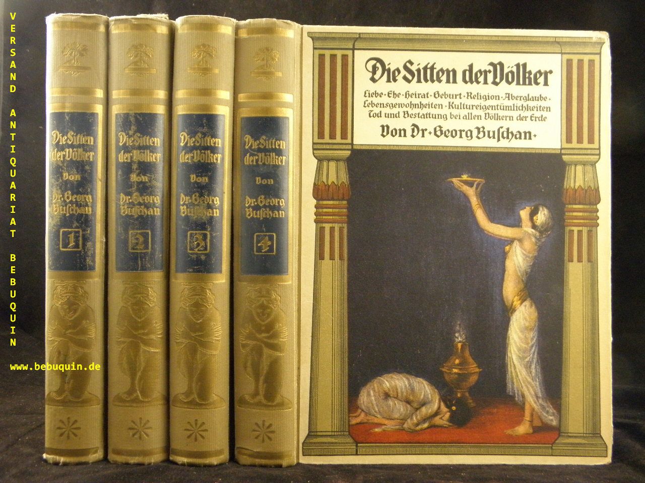 BUSCHAN, Georg: Die Sitten der Völker. Liebe – Ehe – Heirat – Geburt – Religion – Aberglaube – Lebensgewohnheiten – Kultueigentümlichkeiten. Tod und Bestattung bei allen Völkern der Welt. 4 Bände. Stuttgart (Union), 1915 ff. 4°. VIII, 432 (IV), 459, 1, IV, 444, VIII, 462, 2 Seiten mit zahlr. teils ganzseitigen teils farb. Abb. und Bildtafeln. farb. ill. OLn mit reicher Deckel- und Rückenvergoldung, dreiseitigem Rotschnitt. Kanten teils berieben, Deckel mit einigen Kratzspuren, insgesamt noch gutes Ex. Bd. 1: Australien und Ozeanien. Asien mit 500 Textabb, 11 farb. Kunstbeilagen – 12 Kunstblättern in Doppeltondruck. Bd. 2: Asien. Afrika. Mit 522 Textabb. 11 farb. Kunstbeilagen und 12 Kunstblättern. Bd. 3: Afrika. Amerika. Europa. Mit 477 Textabb, 6 farb. Kunstbeilagen und 9 Kunstblättern. Bd. 4: Das Deutsche Volk in Sitte und Brauch. Mit 353 Textabb. 4 farb. Kunstbeilagen und 11 Kunstblättern.