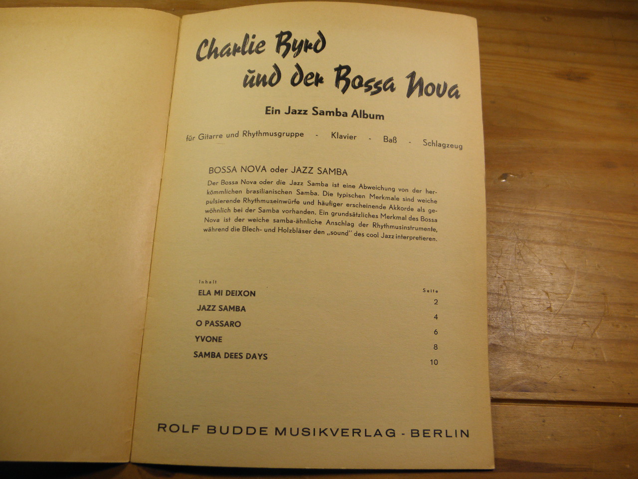 SONGBOOKS.– BYRD, Charlie: und der Bossa Nova. Ein Jazz Samba Album für Gitarre und Rhythmusgruppe, Klavier, Baß, Schagzeug. Berlin (Budde), 1963. 4°. 12 S. mit Noten. ill. OKart. gutes Ex. EA. Inhalt siehe Foto.
