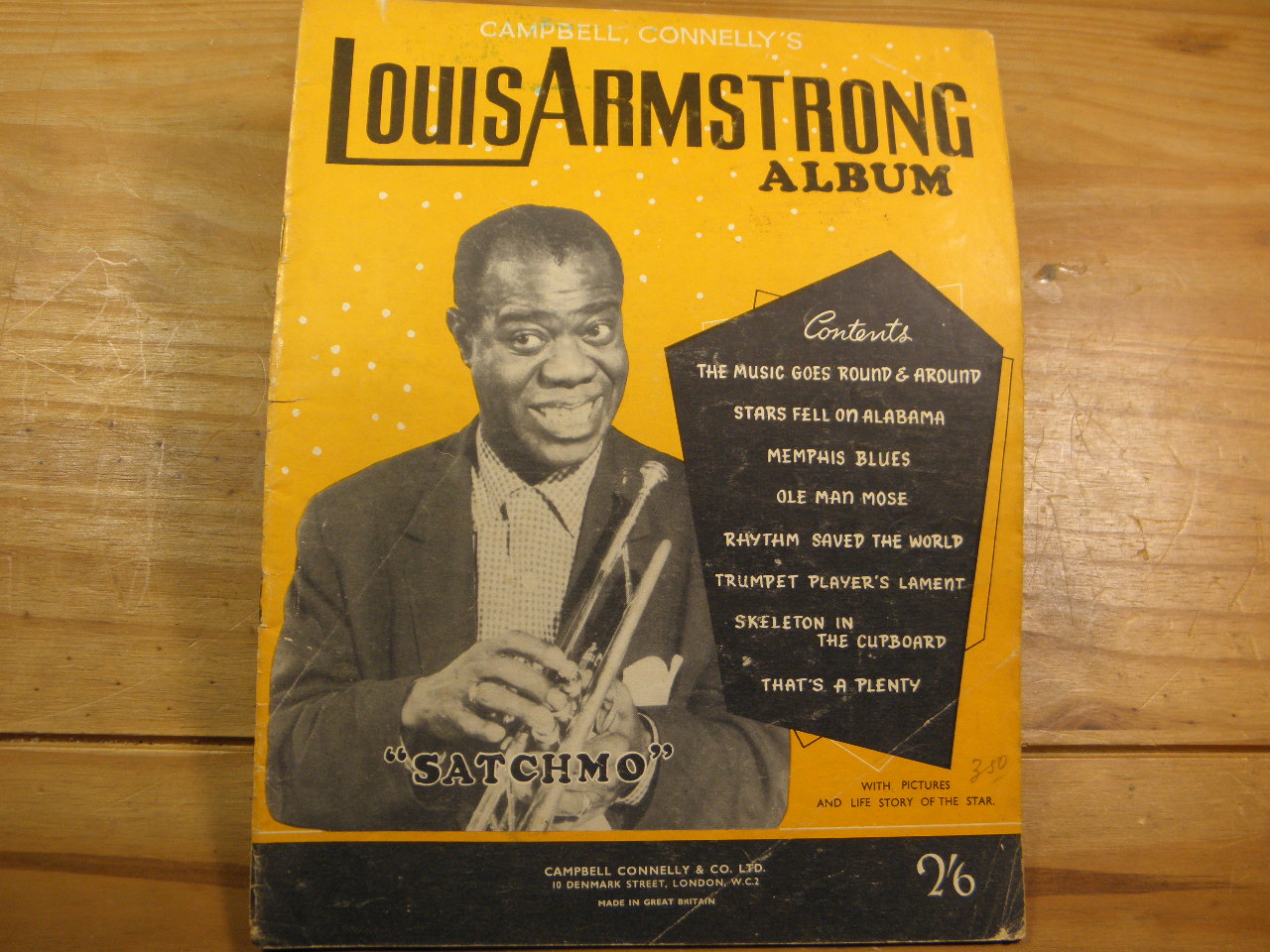 SONGBOOKS.– ARMSTRONG, Louis: „Satchmo“. Album. Gesang und Klavier. London (Campbell Connelly), ca 1940. 4°. 20 S. mit Noten und Mittelbild. ill. OKart. etwas bespielt. EA. Inhalt siehe Foto.