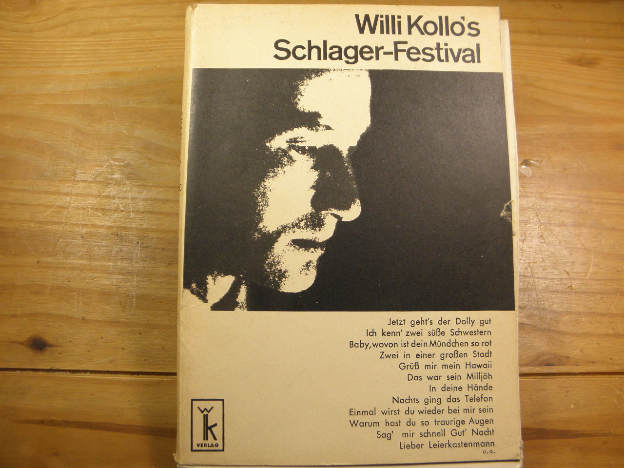 SONGBOOKS.– KOLLO, Willi: Schlager – Festival. Walter (!) Kolo’s Meisteroperette. Für großes Orchester. Berlin (Kollo), 1963. 4°. Noten für 20 Instrumente. ill. OKart.Mappe. gutes Ex. EA. Inhalt siehe Foto.