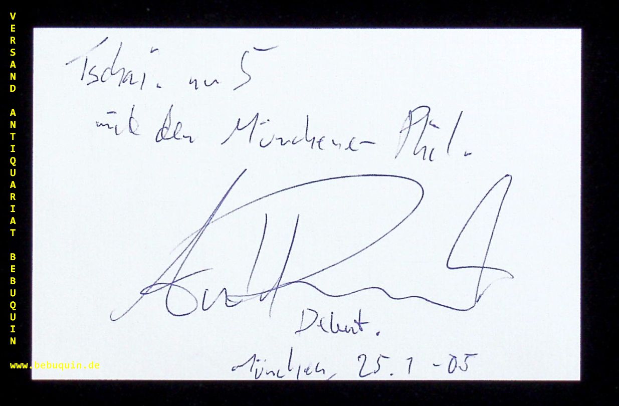 REMMEREIT, Arild (Dirigent): eigenhändig signierte und datierte Autogrammkarte. München (Philharmonie), 25.1.2005. 8 x 12,5 cm. Karteikarte. Born in Norway, Remmereit began piano lessons at the age of six, studied trumpet and performed as a boy soprano. In 1986 he graduated from the Norwegian Conservatory of Music, earning master degrees in voice, piano (jazz and classical), and composition. It was at a conducting seminar in 1985 at the Aspen Music Festival that he was inspired to change his focus. From 1987 to 1992 he studied conducting in Vienna under the direction of Prof. Karl Österreicher at the Hochschule für Musik und Darstellende Kunst, where he also participated in a master class with Zubin Mehta. Remmereit studied with Leonard Bernstein at the Orchestra dell’Accademia Nazionale di Santa Cecilia in Rome, and assisted him in several recordings in Vienna between 1987 and 1990.