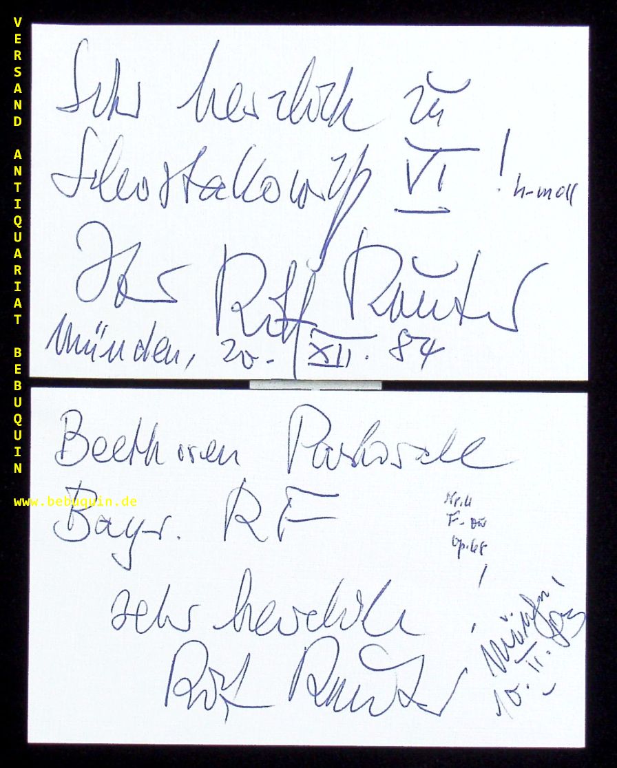 REUTER, Rolf (Dirigent): 2 eigenhändig signierte und datierte Autogrammkarten. München (Herkulessaal), 1983 + 1984. 8 x 12,5 cm. 2 Karteikarten. Rolf Friedrich Reuter (* 7. Oktober 1926 in Leipzig; † 10. September 2007 in Berlin) war ein deutscher Dirigent und Hochschullehrer, der sich am Anfang seiner Karriere auch kompositorisch und pianistisch betätigte. Er wirkte zunächst an den Opernhäusern Eisenach (1951–1955), Meiningen (1955–1961), Leipzig (1961–1979) und Weimar (1979–1981). Den Höhepunkt seines musikalischen Schaffens hatte er ab 1981 als Generalmusikdirektor an der Komischen Oper Berlin, deren Ehrenmitglied er 1993 wurde. Weitere Akzente setzte er in den 1970er und 1980er Jahren als Gastdirigent an der Deutschen Staatsoper Berlin. (Wikipedia)