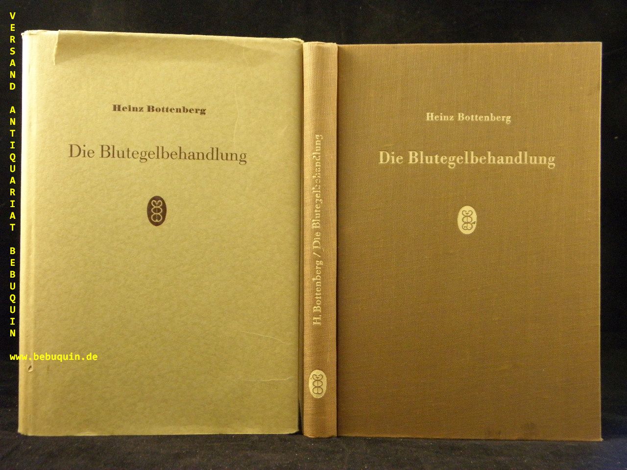 MEDIZIN.– BOTTENBERG, Heinz: Die Blutegelbehandlung. Ein vielseitiges Verfahren der Biologischen Medizin. Erläutert durch 71 Krankengeschichten. 2. vollständig umgearbeitete und erweiterte Aufl. Stuttgart (Marquardt), 1948. Gr. 8°. 223 S. mit 7 Textbildern und 8 (!) Bildtafeln. OLn mit OUmschl. Umschlag gering lädiert, sonst wie neu.