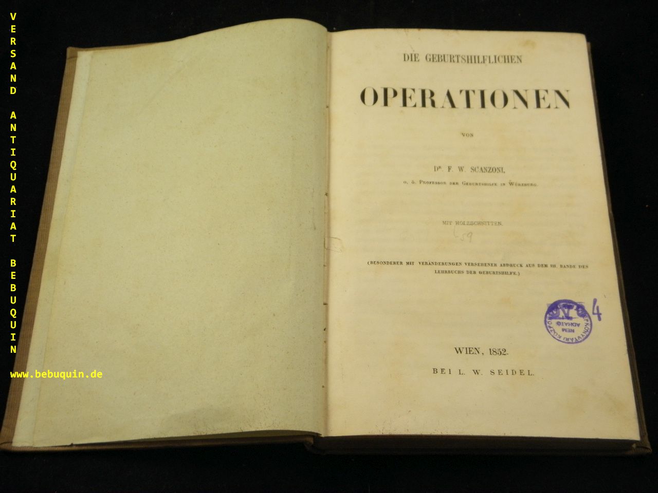 MEDIZIN.– SCANZONI, Friedrich Wilhelm: Die geburtshilflichen Operationen. Wien (Seidel), 1852. IV, 331 S. mit 59 Holzschmitten. Ln der Zeit mit blindgeprägtem Rücken. kaum bestaubt, StaT, gutes Ex. = Besonderer mit V eränderungen vbersehener Abdruck aus dem III. Band des Lehrbuchs der Geburtshilfe. seltene EA der ersten eigenständigen Buch-Veröffentlichung des wichtigen deutschen Gynäkologen.