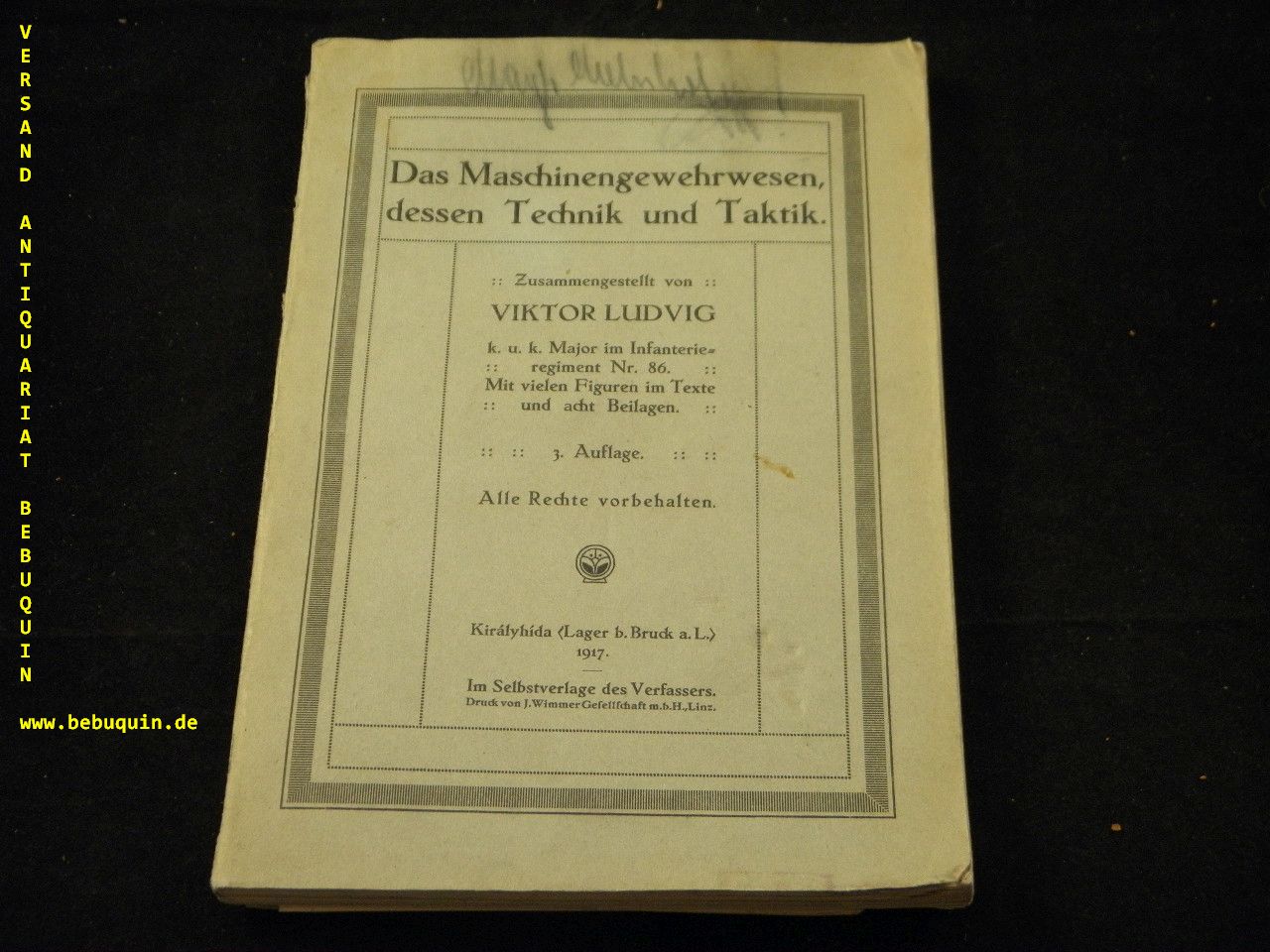WAFFEN.– LUDVIG, Viktor: Das Maschinengewehrwesen,dessen Technik und Taktik. 3. Aufl. Linz (Wimmer), 1993. Gr. 8°. 191 S. mit zahlr. Bildern. OPb mit vielen Textfiguren + 8 Beilagen. OKart. leicht bestoßen, gutes Ex. selten.