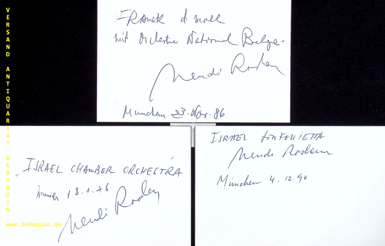 RODAN, Mendi (Violinist): 3 eigenhändig signierte und datierte Autogrammkarten. München (Philharmonie), 1976 – 1990. 8 x 12,5 cm. 3 Karteikarten. Mendi Rodan, geboren als Mendi Rosenblum, (* 17. April 1929 in Rumänien; † 9. Mai 2009 in Jerusalem) war ein israelischer Violinist und Dirigent rumänischer Herkunft. (Wikipedia)