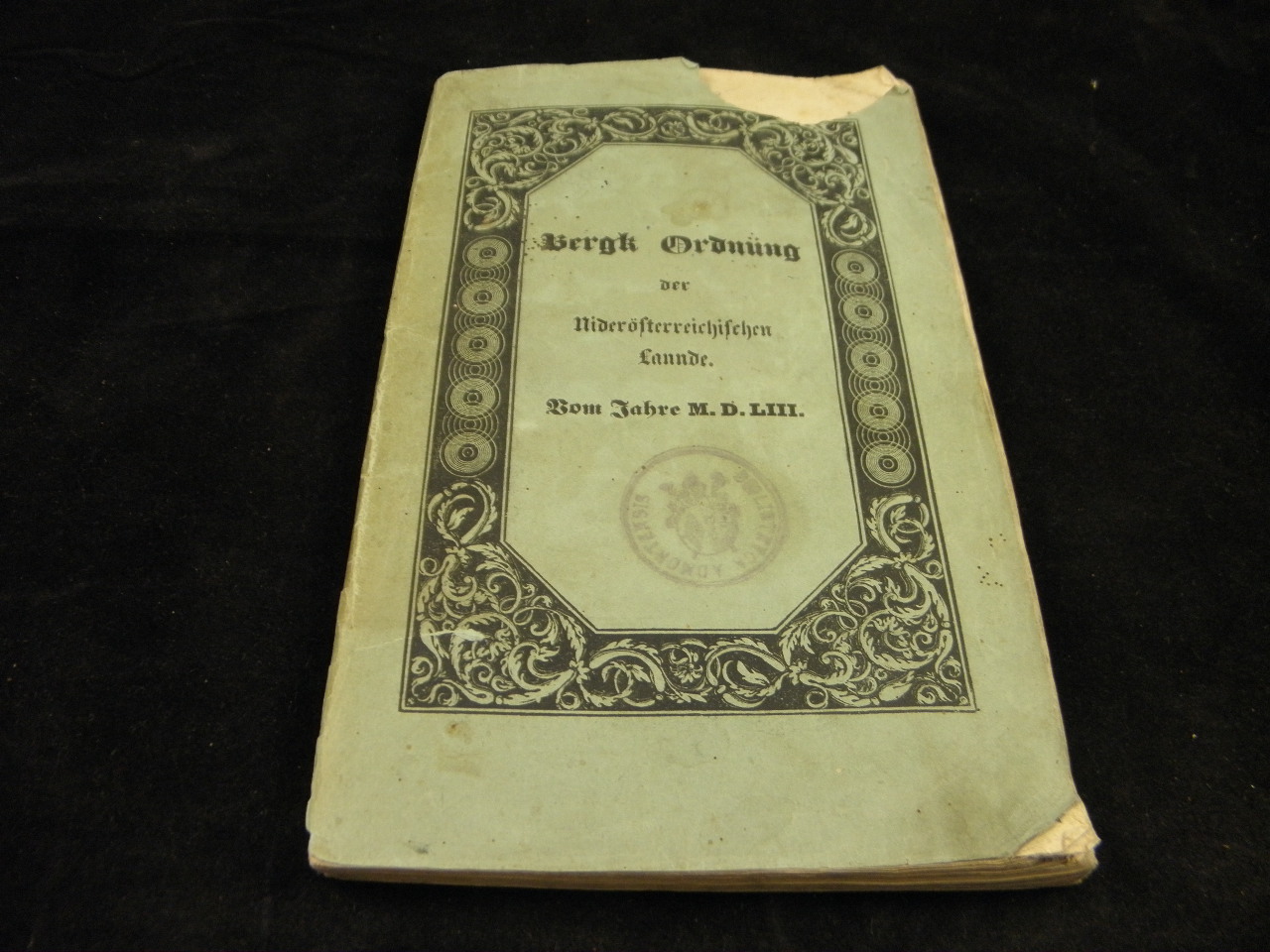 BERGBAU.– BERGK ORDNÜNG DER NIDERÖSTERREICHISCHEN LANDE.– Vom Jahre 1553. Neue Auflage. Wien (Gerold), 1839. 132 S. ill. OBr. Deckel mit Randabriss, einige Stempelungen und Ex libris von Heinrich Steininger sowie ein längeres Leibnitz-Zitat auf Innendeckel