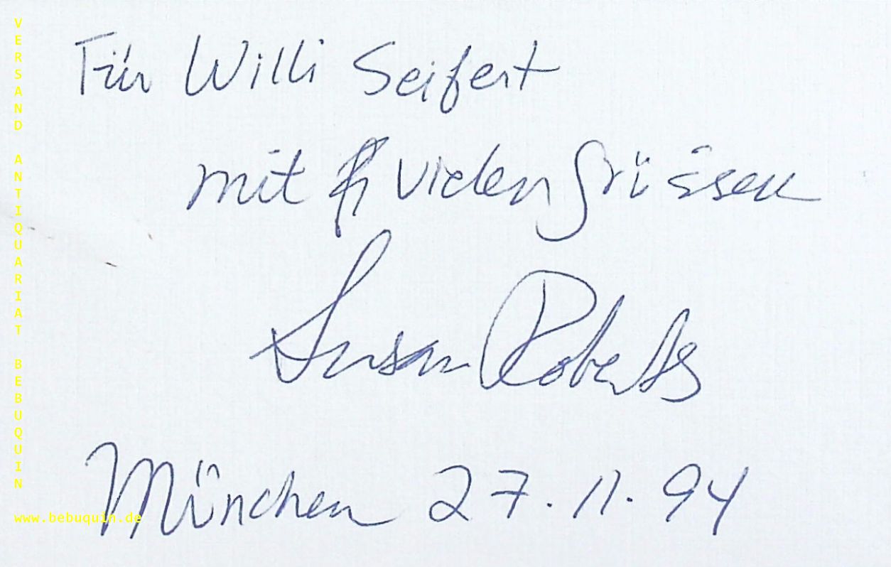 ROBERTS, Susan (Sopran): eigenhändig signierte und datierte Autogrammkarte. München (Philharmonie), 27-11-1994. 8 x 12,5 cm. Karteikarte. Susan Roberts (* 1960, nach Kutsch/Riemens * 1958, in New York City) ist eine amerikanische Opernsängerin (Sopran). (Wikipedia)