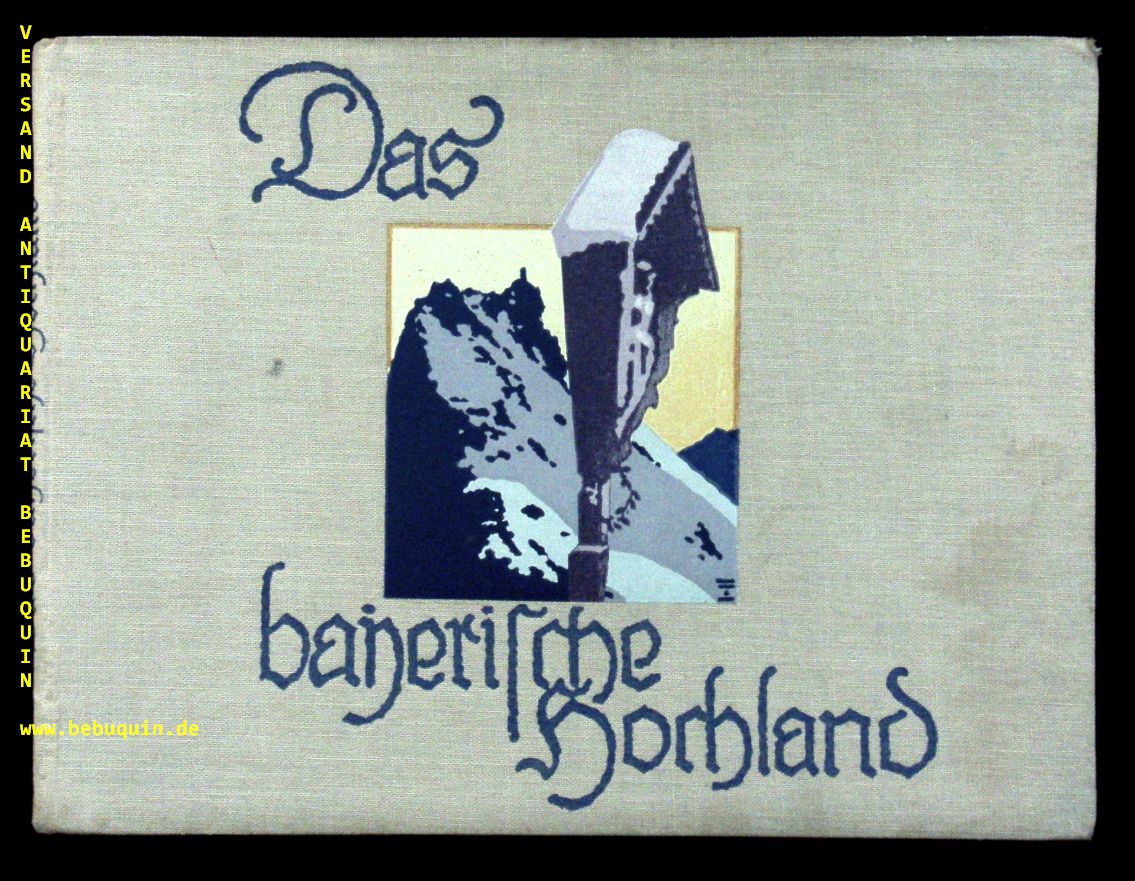 BAYERN.– DREYER, A.: Das bayrerische Hochland. Mit Salzburg und Innsbruck. Eine Wanderung durch deutsches Alpengebiet. Kleine Ausgabe. Stuttgart (Union), ca ca 1920. Quer 4°. 16 S. + 48 Bildtafeln in Kupfertiefdruck. ill. OLn. von Ludwig Hohlwein. etwas bestaubt. 1. Aufl. dieser Ausgabe.