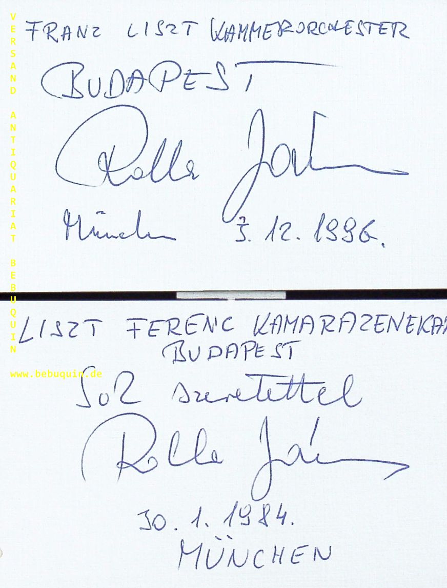 ROLLA, Janos (Dirigent, Violinist): 2 eigenhändig signierte und datierte Autogrammkarten. München, 1984 – 1996. 8 x 12,5 cm. 2 Karteikarten. János Rolla (Kotelek, 30 de septiembre de 1944) es un violinista y director de orquesta húngaro. En 1985 le fue concedido el Premio Kossuth, la más alta distinción cultural que concede el estado húngaro. (Wikipedia)