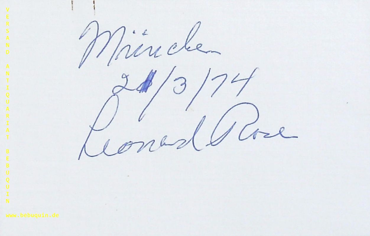 ROSE, Leonard (Cellist): eigenhändig signierte und datierte Autogrammkarte. München (Herkulessaal), 21.3.1974. 8 x 12,5 cm. Karteikarte. Leonard Rose (* 27. Juli 1918 in Washington, D.C.; † 16. November 1984 in White Plains, New York) war ein US-amerikanischer Cellist. (Wikipedia)