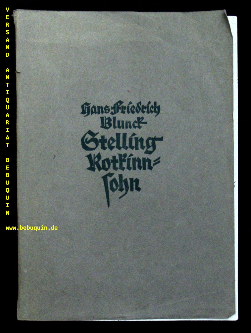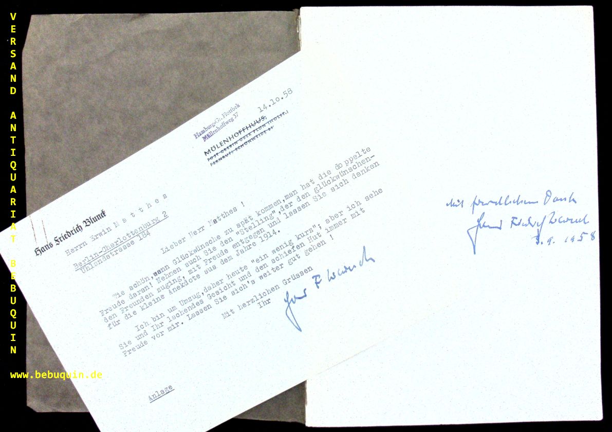 BLUNCK, Hans Friedrich: Stelling Rotkinnsohn. Die Geschichte eines Verkünders und seines Volkes. München (Georg Müller), 1924. 302 (4) S. OBr. leicht gelockert. EA WG² 21 mit einer eigenhändigen datierten Widmung des Dichters auf Vorsatz, sowie einem eigenhändig signierten Ms-Brief mit sehr spitzer Feder: „Wie schön, wenn Glückwünsche zu spät kommen, man hat die doppelte Freude daran.“ und weitere Korrespondenz zum Erbe des Dichters beiliegend.