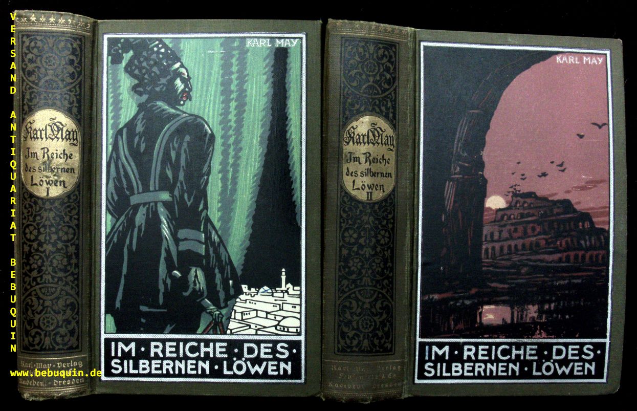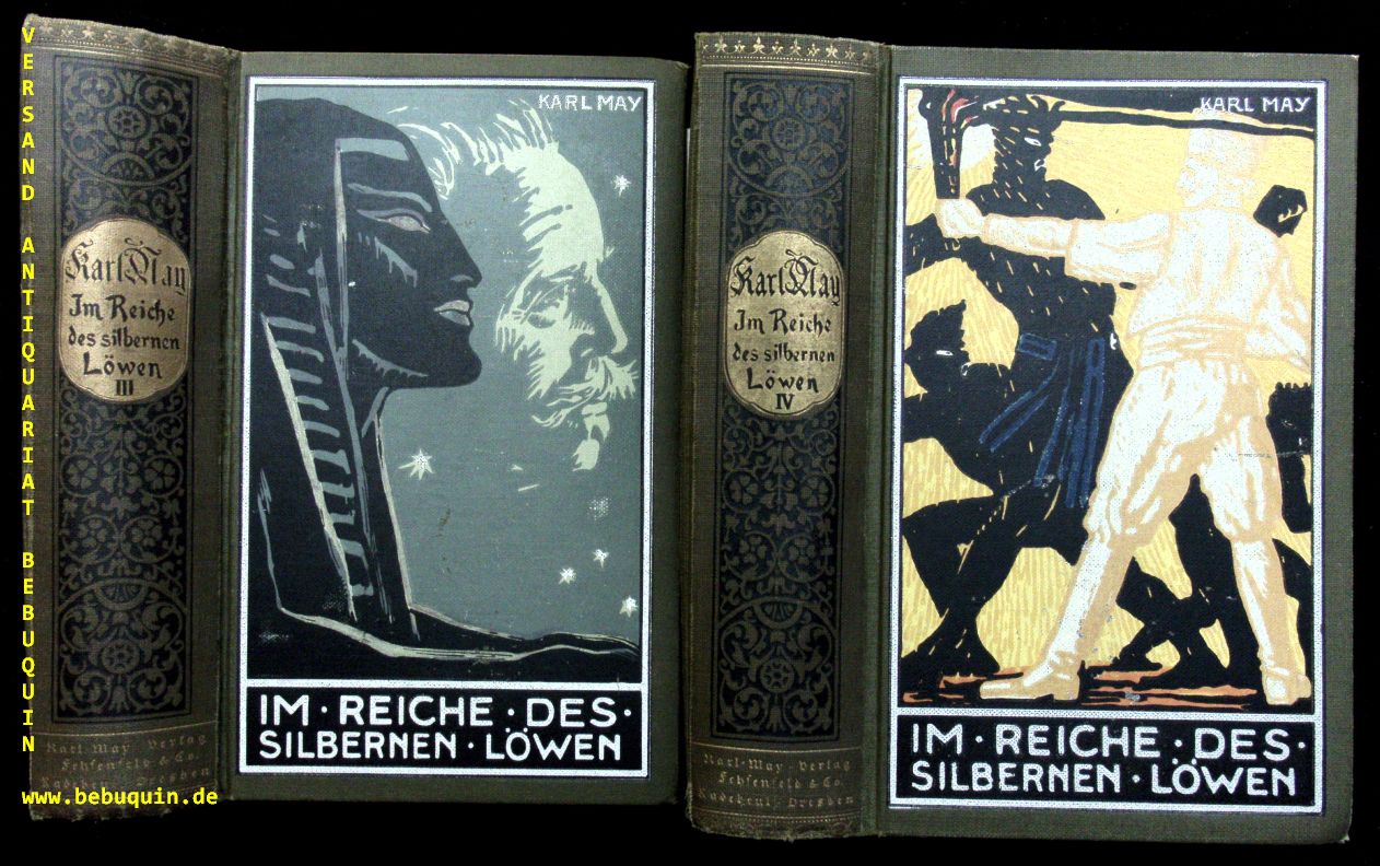 MAY, Karl: Im Reiche des silbernen Löwen. Bände I – IV. Reiseerzählung. 107.– 120., 97.– 107., 88.– 97., 94 – 107. Tsd. 4 Bände. Radebeul (Karl May), ca 1937. 491 (3), 628 (3), 636, 644(3) S. farb. ill. OLn. Bd. 2 etwas gelockert, leicht schief gelesen, Ecken teils bestoßen, insgesamt gut. = Gesammelte Werke, Bd. 26 – 29. Hermesmeier / Schmalz GW 26.15; 27.14; 28.15; 29.15 (dieser letzte Band in letzter Auflage ist selten).