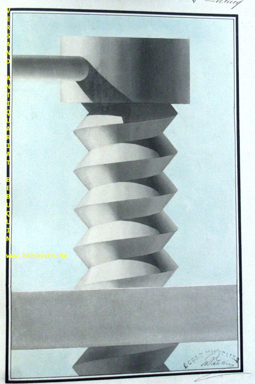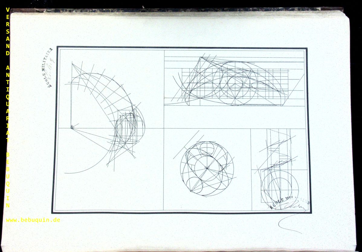ARCHITEKTUR.– LECLERCQ, Alfred: Epures 1860 – 1862. Ecole Militaire. o.O., 1862. 46 x 32 cm. 62 lithographische Tafeln (davon 50 s/w (4 doppelblattgross) sowie 6 handkoloriert (2 doppelblattgross) + 3 Tafeln auf liniertem Papier. OHLdr mit goldgeprägtem Rücken und ebensolchem Deckelschild. wenige Tafeln teils stärker gebräunt, eine mit kleinem Einriss, insgesamt sehr ordentlich. EA dieser wohl einmaligen von mir nicht näher zuordenbaren Veröffentlichung mit 62 eigenhändig signierten Bildtafeln.