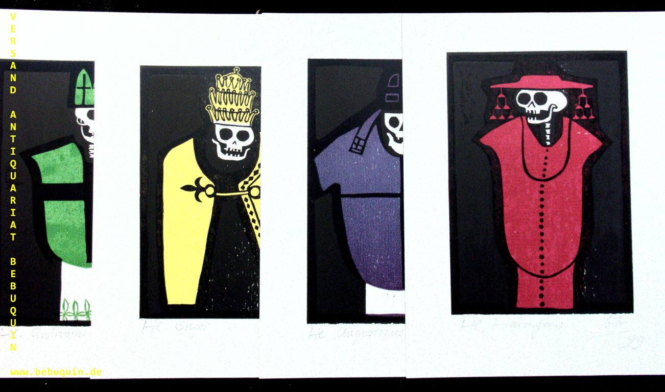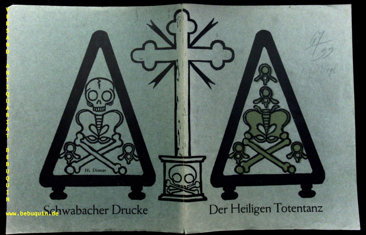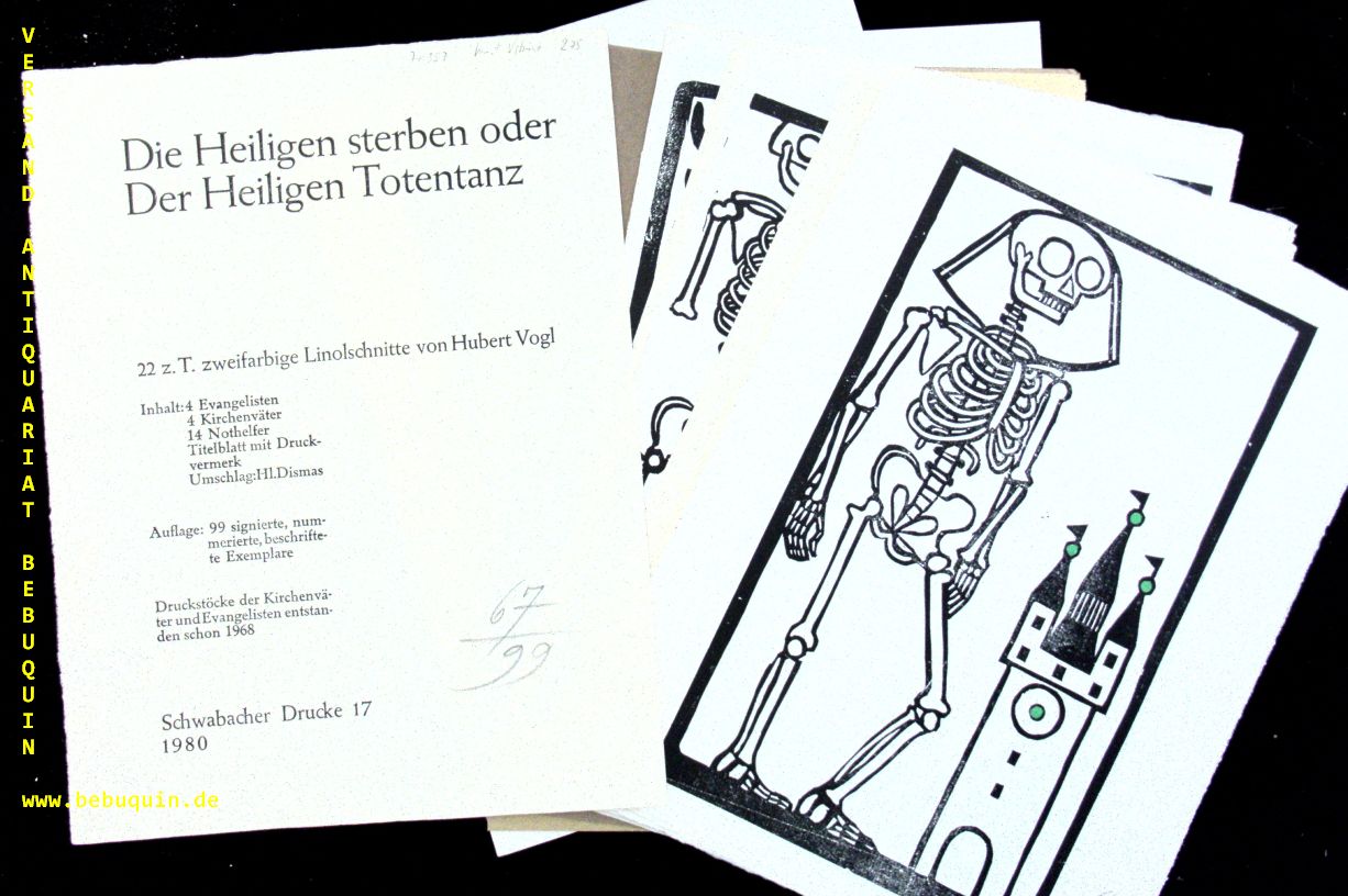 VOGL, Hubert: Die Heiligen sterben oder Der Heiligen Totentanz. Schwabach, 1980. 32 x 25 cm. 22 z. T. zweifarb. Linolschnitte eigenhändig betitelten und numerierten Exemplaren. ill. OUmschl. feines Ex. = Schwabacher Drucke 17. Auf dem Umschlag eigenhändig signiert. Nr. 67 v. 99 Expl. Inhalt: 4 Evangilisten; 4 Kirchenväter; 14 Nothelfer, Titelblatt, Umschlag: Hl. Dismas. Hubert Vogl (* 6. Oktober 1933 in Straubing; † 21. Februar 2012 in Nürnberg) war ein deutscher Grafiker und Maler. Überregional bekannt wurde er durch die Gründung der Schwabacher Drucke, einer Werkstatt zur Herstellung von graphischen Büchern mit Handpressen in kleinen Auflagen bis 500 Stück. (Wikipedia)