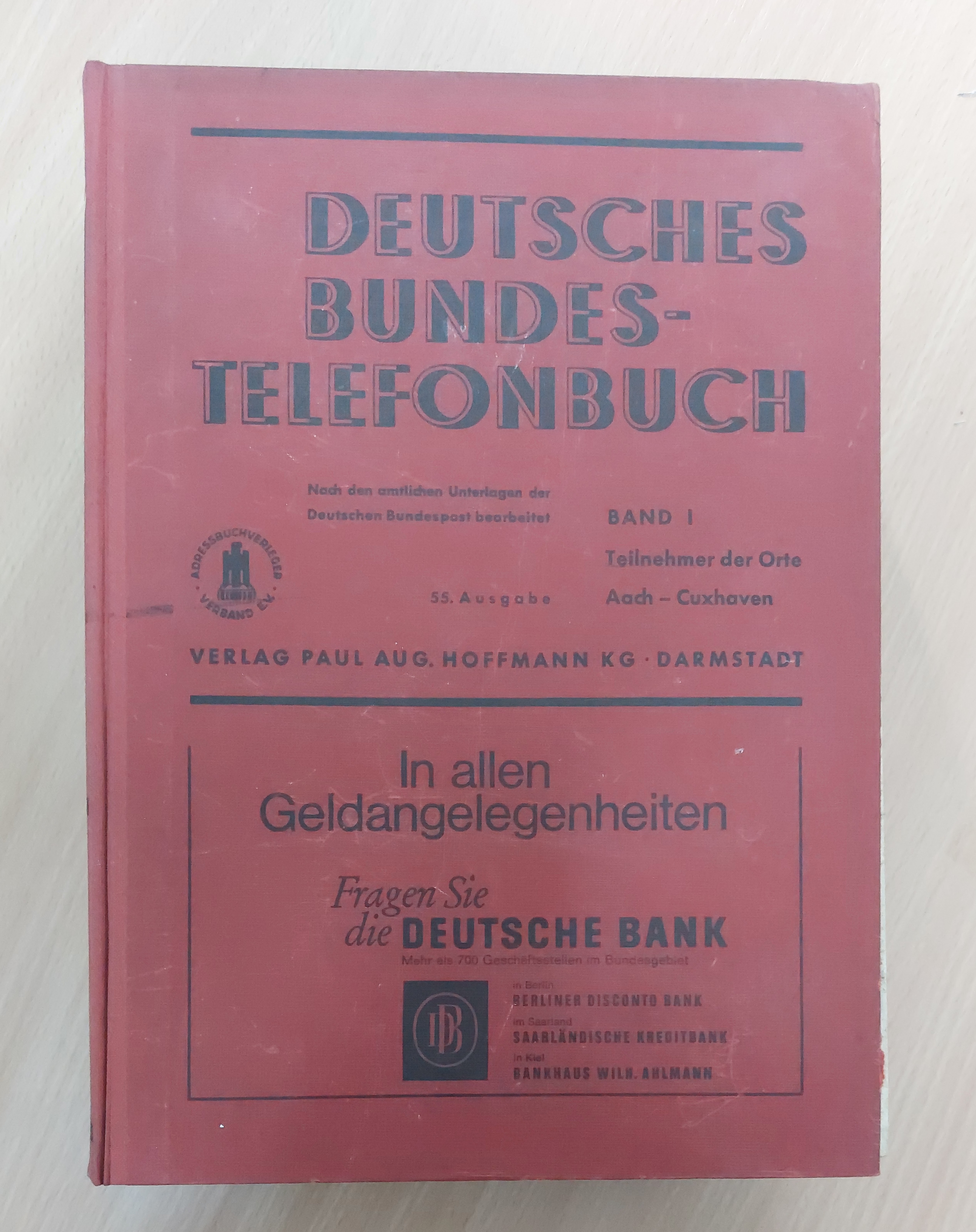 DEUTSCHLAND.– DEUTSCHES BUNDES TELEFONBUCH.– 55. Ausgabe 1966. Bd. I.: A – C. vormals Reichs-Telefonbuch. Darmstadt (Hoffmann), 1966. 4°. 1879 S. ill. OHLn. vorderes Gelenk gelockert, sonst gut erhalten. Eine Fundgrube für Rechtsanwälte, Nachlassverwalter und Erbschleicher.