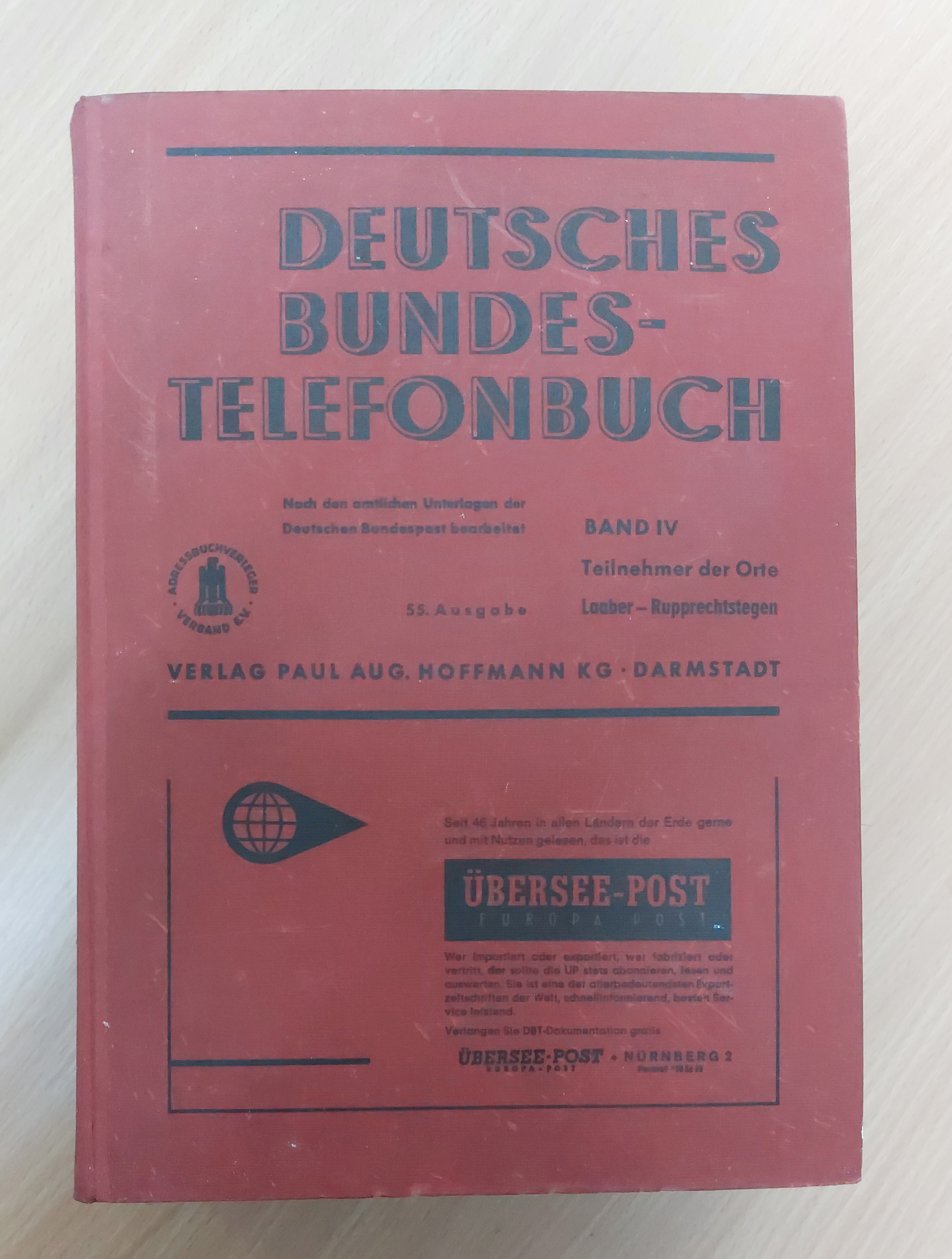 DEUTSCHLAND.– DEUTSCHES BUNDES TELEFONBUCH.– 55. Ausgabe 1966. Bd. IV.: L – R. vormals Reichs-Telefonbuch. Darmstadt (Hoffmann), 1966. 4°. S. 5589 – 7736. ill. OHLn. gut erhalten. Eine Fundgrube für Rechtsanwälte, Nachlassverwalter und Erbschleicher.