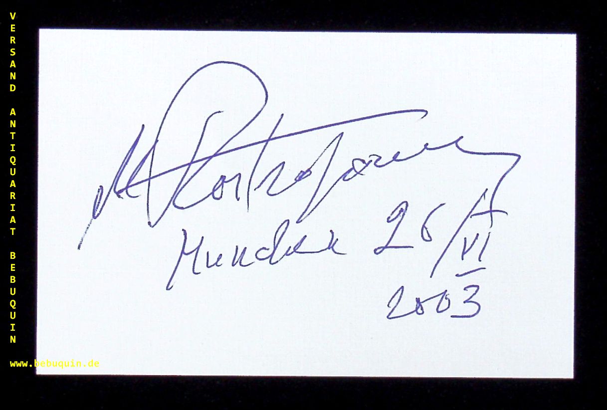 ROSTROPOWITSCH, Mstislaw (Cellist): eigenhändig signierte und datierte Autogrammkarte. München, 26.6.2003. 8 x 12,5 cm. Karteikarte. Mstislaw Leopoldowitsch Rostropowitsch (* 27. März 1927 in Baku; † 27. April 2007 in Moskau) war ein russischer Cellist, Dirigent, Pianist, Komponist und Humanist. Er gilt als einer der bedeutendsten Cellisten der Geschichte. (Wikipedia)