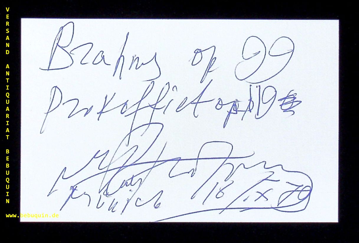ROSTROPOWITSCH, Mstislaw (Cellist): eigenhändig signierte und datierte Autogrammkarte: Brahms op. 99. München, 18.10.1979. 8 x 12,5 cm. Karteikarte. Mstislaw Leopoldowitsch Rostropowitsch (* 27. März 1927 in Baku; † 27. April 2007 in Moskau) war ein russischer Cellist, Dirigent, Pianist, Komponist und Humanist. Er gilt als einer der bedeutendsten Cellisten der Geschichte. (Wikipedia)