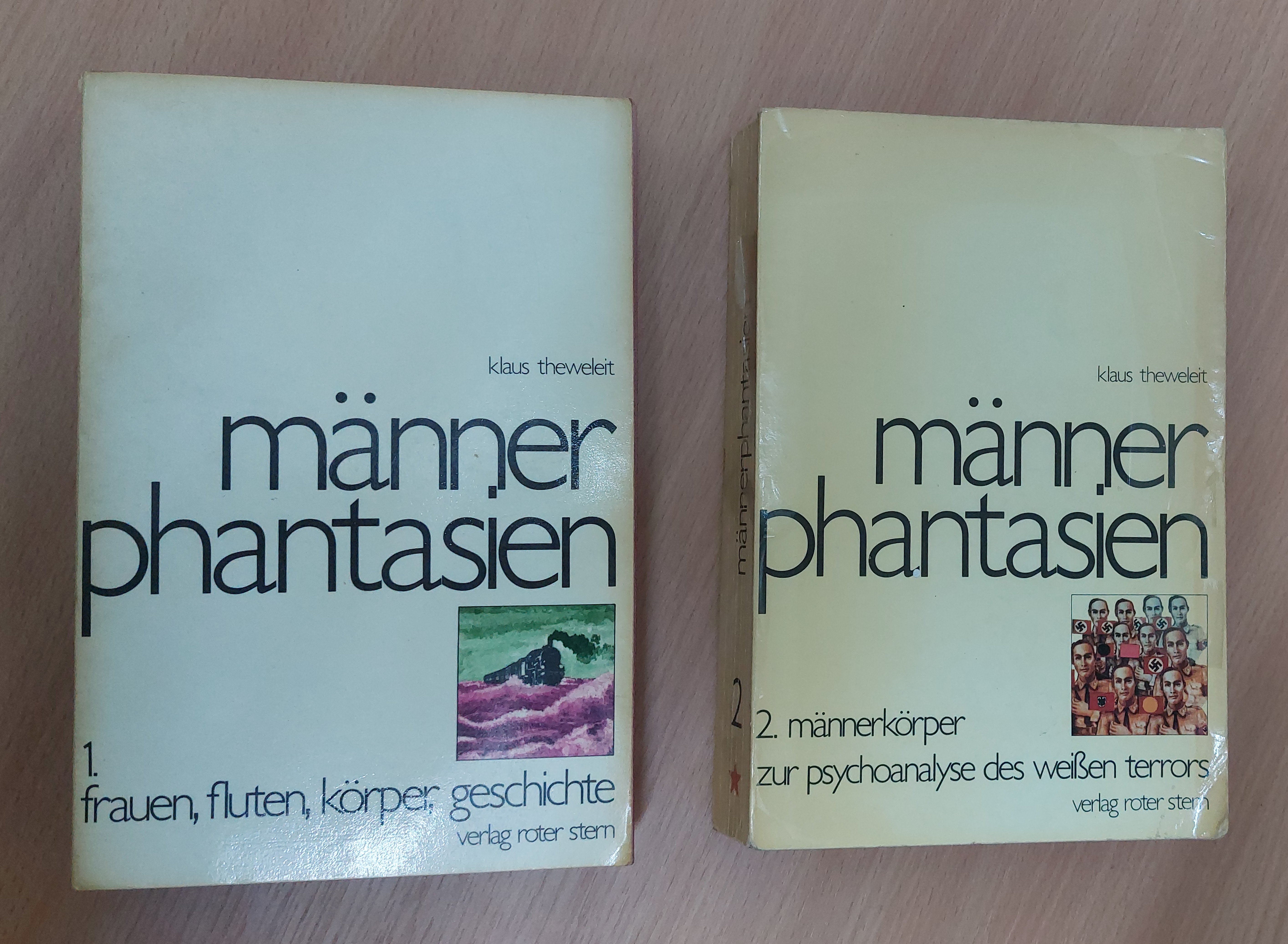 THEWELEIT, Klaus: Männerphantasien. 1. + 2. B and. Mischauflage 2 Bände Basel/Frankfurt am Main, (Roter Stern), 1978/79. 611, 564 S. mit zahlr. Bildern und dreiseitigem Rotschnitt. ill. OKart. Band 2 am Einband etwas abgeblättert.