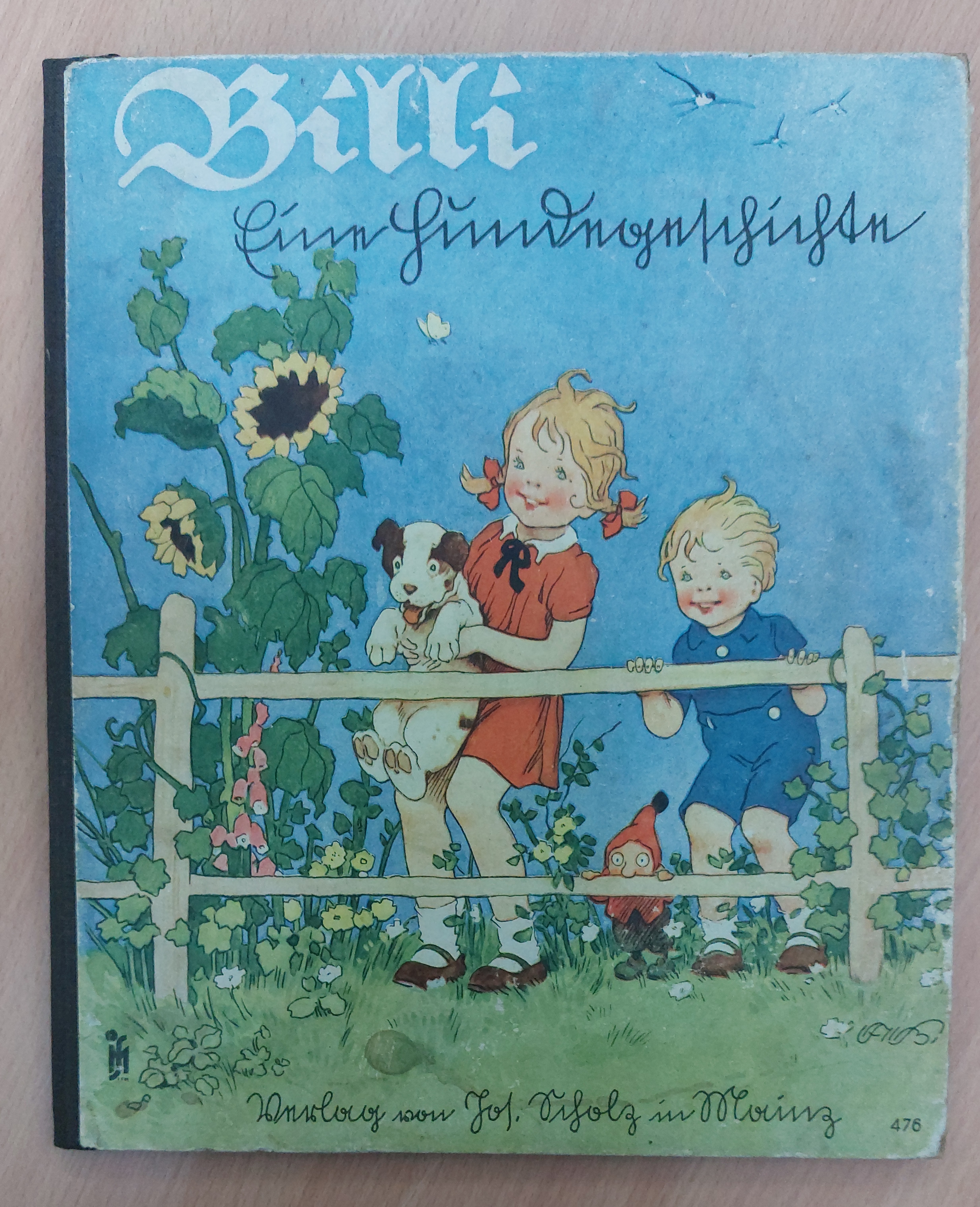 BAUMGARTEN.– IPF: (d.i.: Hermann Siegmann) Billi. Eine Hundegeschichte. Mainz (Jos. Scholz), (1938). 4°. 10 Bl. (einschl. Titelblatt) mit durchweg farb. Bildern und farb. Vorsatzbildern von Fritz Baumgarten. farb. ill. OHLn. Kanten etwas berieben, Widmungsseite mit Farbstift ausgefüllt, anfangs und am Ende stärker fingerspurig. Sehr seltene EA dieses Bilderbuches. Hier mit einer verlagsseitigen Dopplung der Vorsätze auif erster und letzter Seite (kurios). Blaume 176. Einband und Titel in Sütterlin.