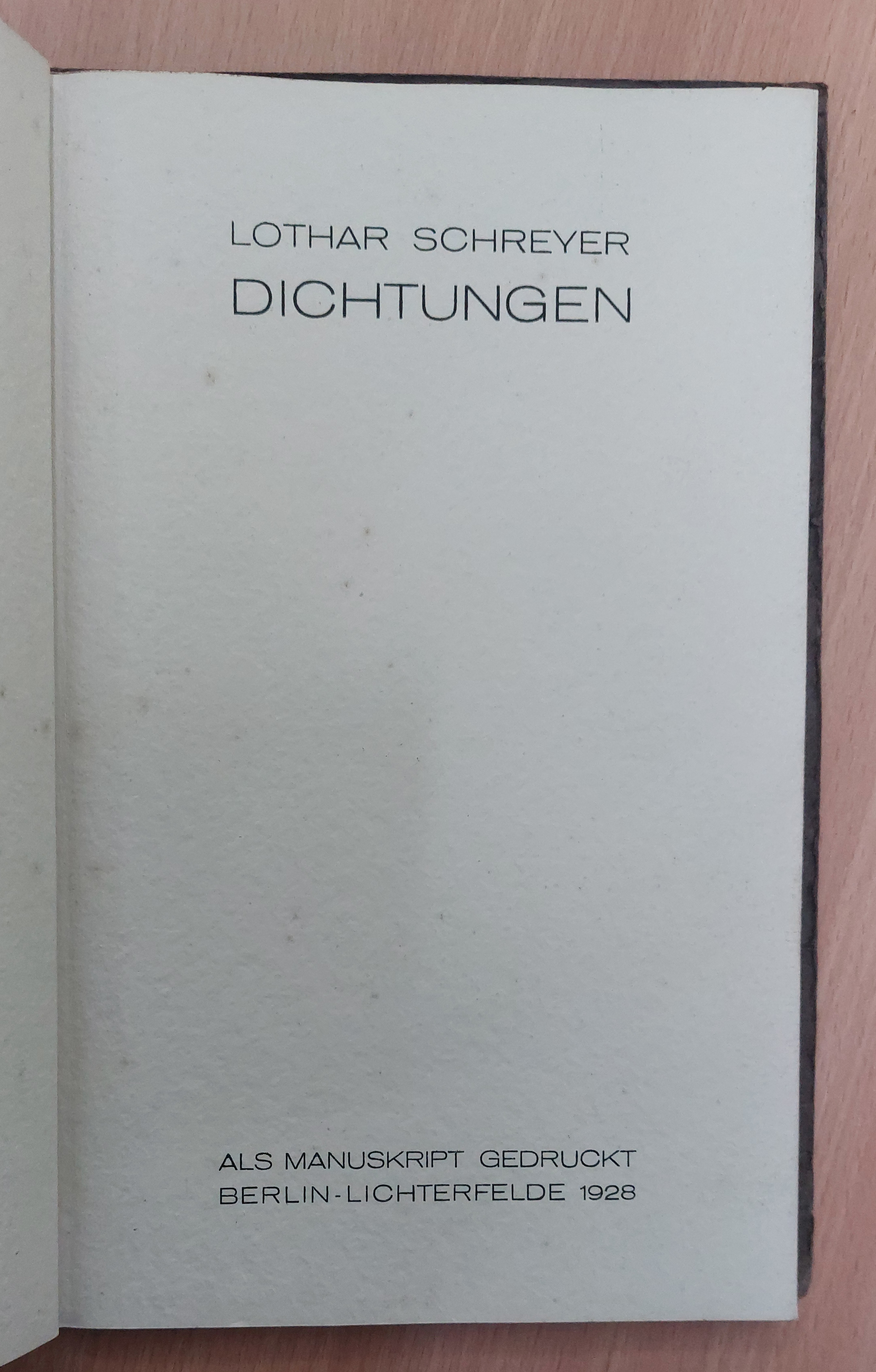 SCHREYER, Lothar: Dichtungen. Die Namen der Maria. Berlin, Lichterfelde, 1928. Gr. 8°. 26 S. mit farbigen Original-Holzschnitt (Franziskusblümlein) als Frontispiz. schlichter OKart in Kordelbindung. EA des expressionistischen Frühwerks mit einer persönlichen eigenhändigen auf Neujahr 1933 datierten und voll signierten Widmung auf Titelseite. Raabe 268/10