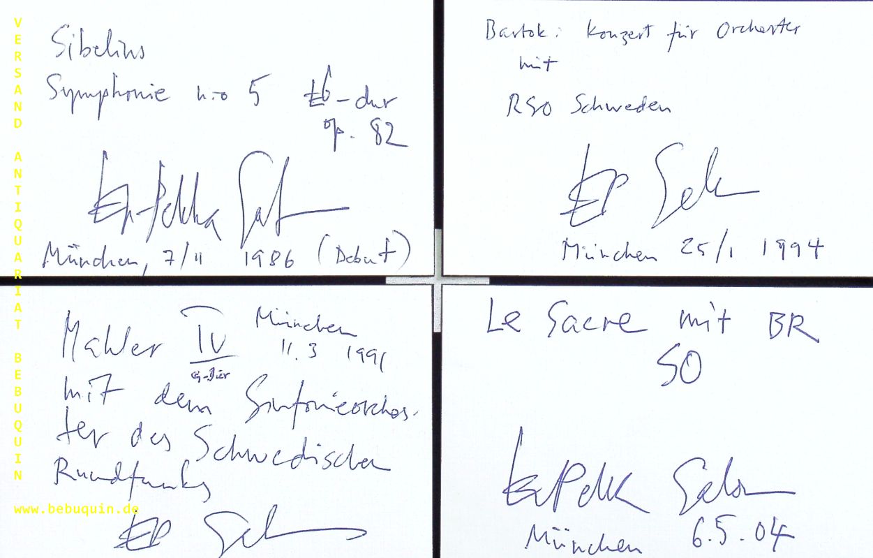 SALONEN, Esa-Pekka (Dirigent): 5 eigenhändig signierte und datierte Autogrmmkarten mit umfangreichen eigenhändigen Programmbeschreibungen. München, 1986 – 2004. 8 x 12,5 cm. 5 Karteikarten. Esa-Pekka Salonen Zum Anhören bitte klicken!Abspielen (* 30. Juni 1958 in Helsinki) ist ein finnischer Dirigent und Komponist. (Wikipedia)