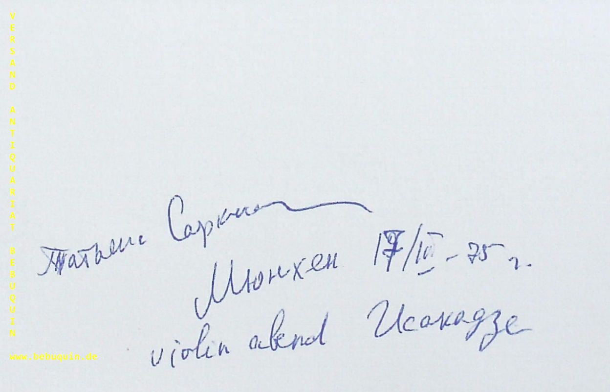 SARKISOWA, Tatjana (Pianistin): eigenhändig signierte und datierte Autogrammkarte. München (Herkulessaal), 17.3.1975. 8 x 12,5 cm. Karteikarte. TATIANA SARKISSOVA IS AMONG THE MOST DISTINGUISHED EXPONENTS OF THE MOSCOW SCHOOL OF PIANO PLAYING.