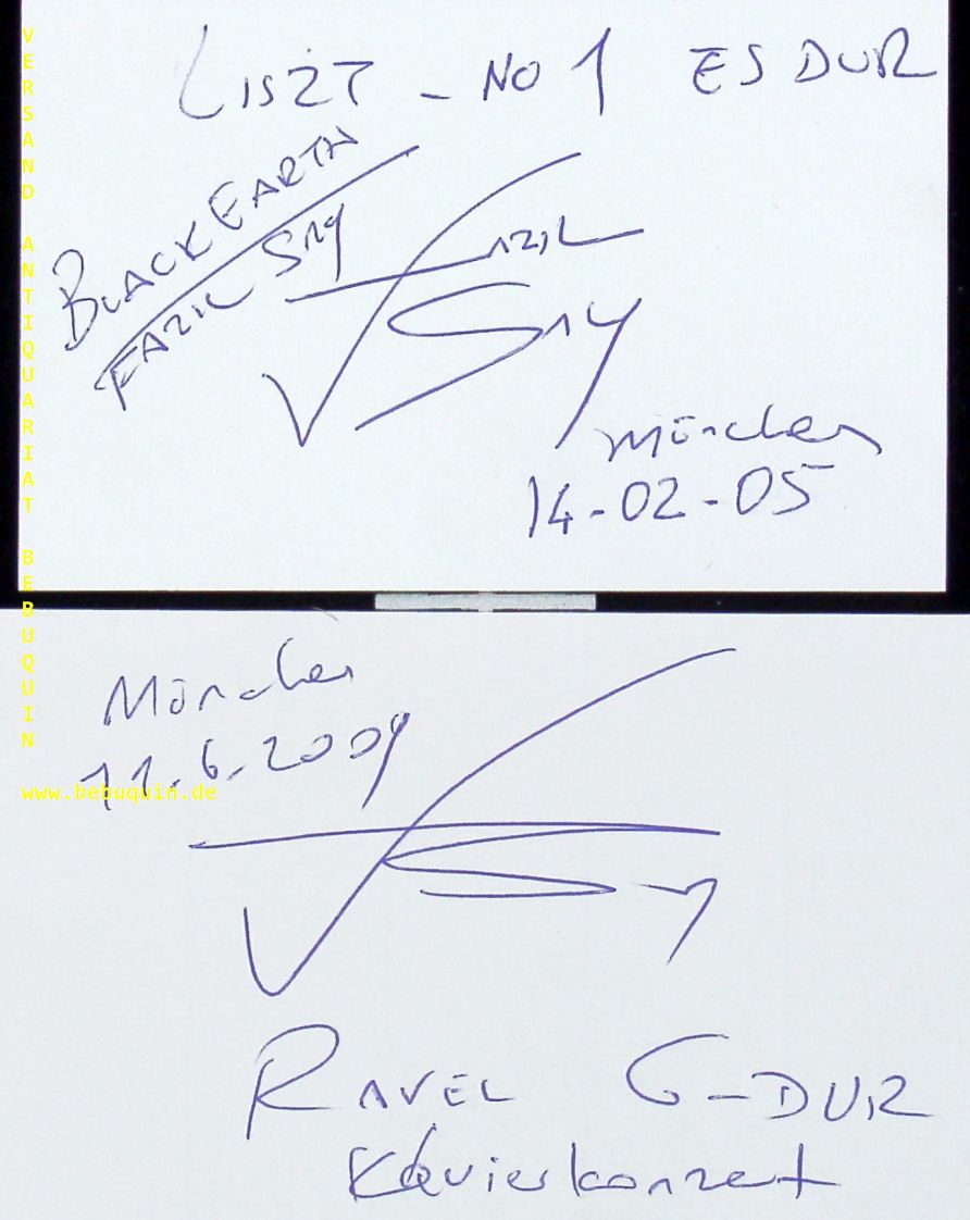SAY, Fazil (Pianist): 2 eigenhändig signierte und datierte Autogrammkarten München (Herkulessaal), 2005 + 2009. 8 x 12,5 cm 2 Karteikarten. Fazil Say (* 14. Januar 1970 in Ankara, Türkei) ist ein international renommierter türkischer Pianist und Komponist. Say ist in der Türkei zudem ein bekannter Bürgerrechtsaktivist. (Wikipedia)