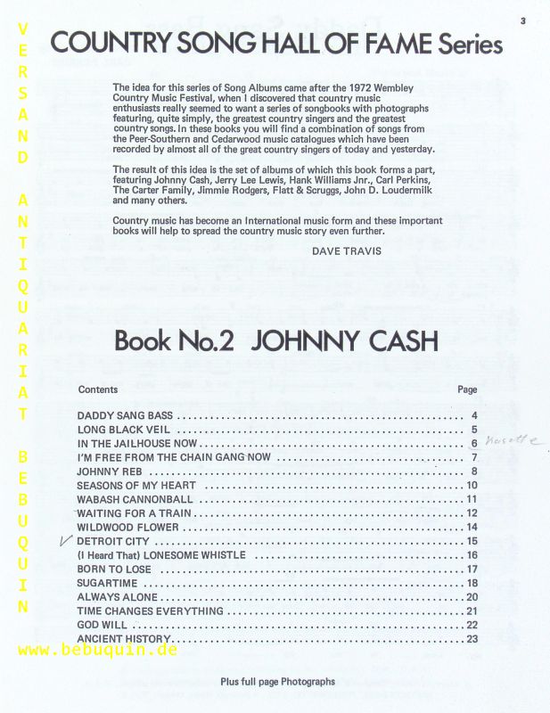 SONGBOOKS.– CASH, Johnny: Country Song. Hall of Fame. London (Southern Music), 1973. 4°. 24 S. mit Noten und Bildern. ill. OKart. gutes Ex. EA.