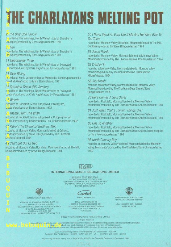 SONGBOOKS.– THE CHARLATANS: Melting Pot. Songbook mit Guitar tablature. Für Voice, Piano und Gitarre. London (IMP), 2000. 4°. 104 S. mit Noten. farb. ill. OKart. gutes Ex. EA.