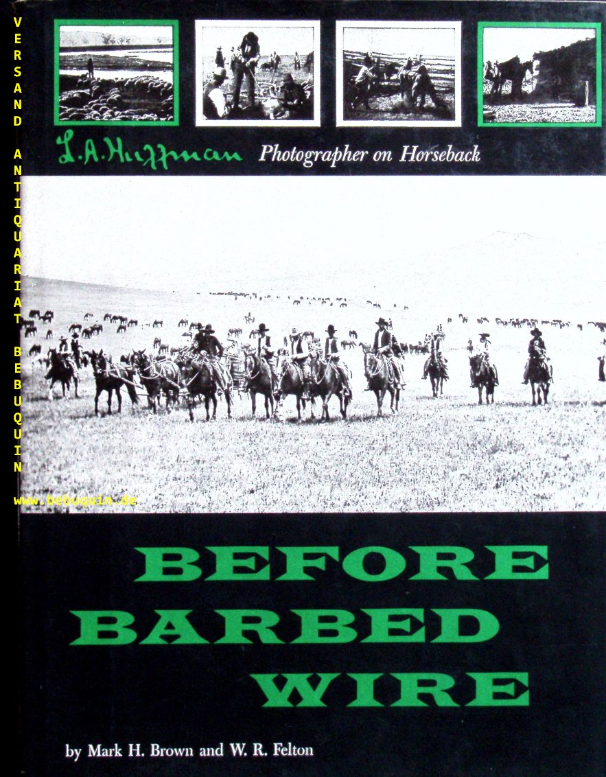 HUFFMAN.– BROWN, Mark H. + FELTON, W.R.: Before Barbed Wire. New York (Bramhall), 1956. 4°. 256 S. mit zahlr. fotografischen Bildtern von L.A. Huffman, Photographer on Horseback. OHLn mit OUmschl. feines Ex. EA. Laton Alton Huffman, besser bekannt als L. A. Huffman (* 31. Oktober 1854 bei Castalia, Iowa; † 28. Dezember 1931 in Billings, Montana) war ein US-amerikanischer Fotograf, der mit seinen Bildern die Zeit der Landnahme und die Natur in Nordamerika, besonders in Montana und North Dakota dokumentierte. (Wikipedia)