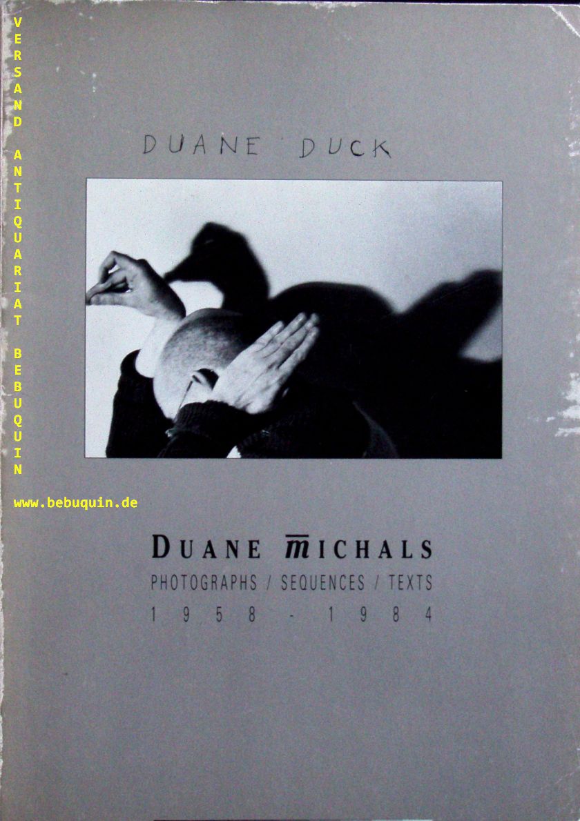 MICHALS, Duane: Duane Duck Photographs / Sequences / Texts 1958-1984. Oxford (Modern Art), 1984. 4°. ca 100 stärkere Bl. mit zahlr. Fotografien. ill. OKart. Kanten etwas berieben. EA. Duane Stephen Michals (* 18. Februar 1932 in McKeesport, Pennsylvania) ist ein US-amerikanischer Fotograf. Weitgehend Autodidakt, sind seine Arbeiten bekannt für ihre Innovationskraft und Kunstfertigkeit. Michals arbeitet oft mit Fotosequenzen und der Einbeziehung von Text, um Gefühlsregung und Lebensanschauung darzulegen, was sich in einem einzigartigen Ergebnis niederschlägt. (Wikipedia)