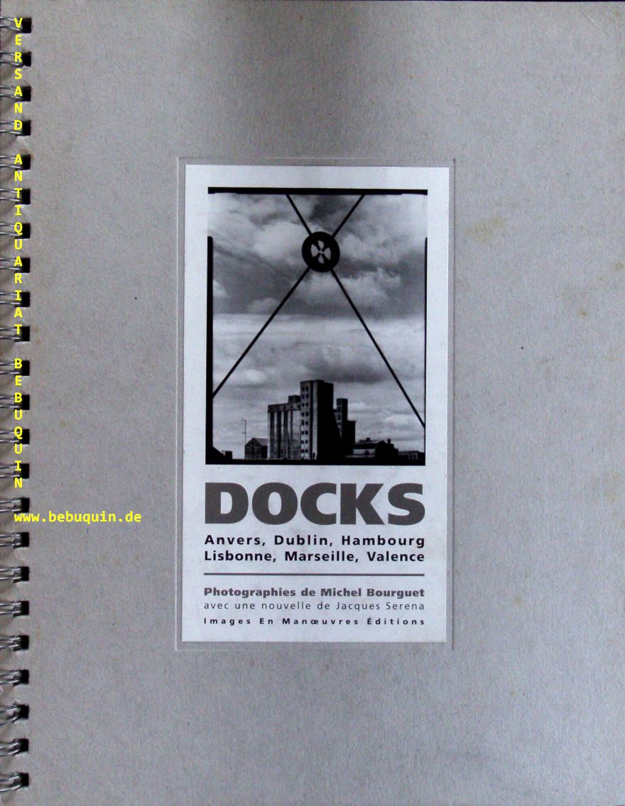 BOURGET, Michel: Docks. Anvers, Dublin, Hambourg, Lisbonne, Marseille, Valence. Photographies avec une nouvelle de Jacques Serena. Marseille (Images En Maneouvres), 1997. 50 Bl. mit Bildtafeln als Rongbuch gebudne. OKart mit mont. Titelbild. NaV, gutes Ex. EA.