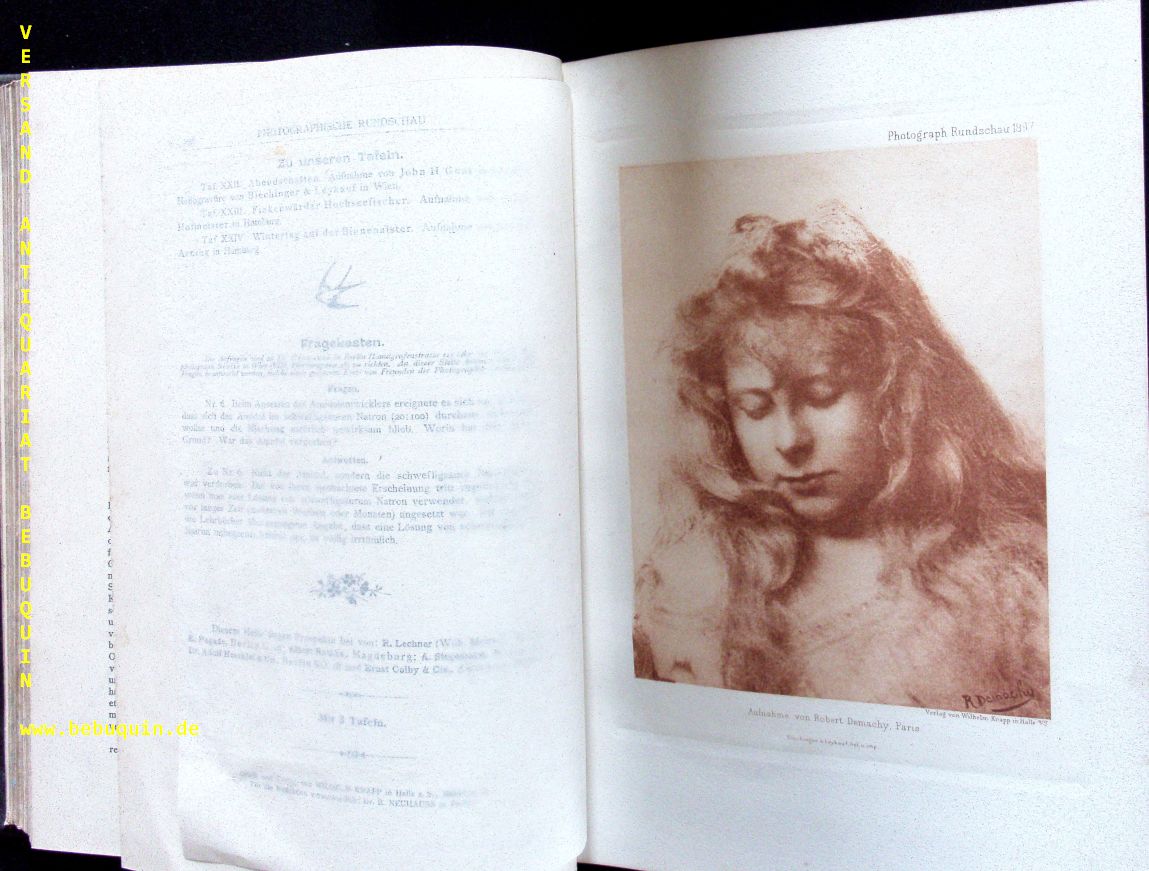 NEUHAUSS, R.: (Hrsg.) Photographische Rundschau – XI. Jahrgang. Zeitschrift für Freunde der Photographie. Angebunden: Vereinsnachrichten. Halle (Knapp), 1897. 4°. XVI, 388, 148 S. mit zahlr. Abb. + 36 Kunstbeilagen. HLdr der Zeit mit goldgeprägtem Rücken. Kanten berieben, innen vereinzelt gebräunt, insgesamt von guter Erhaltung. EA.