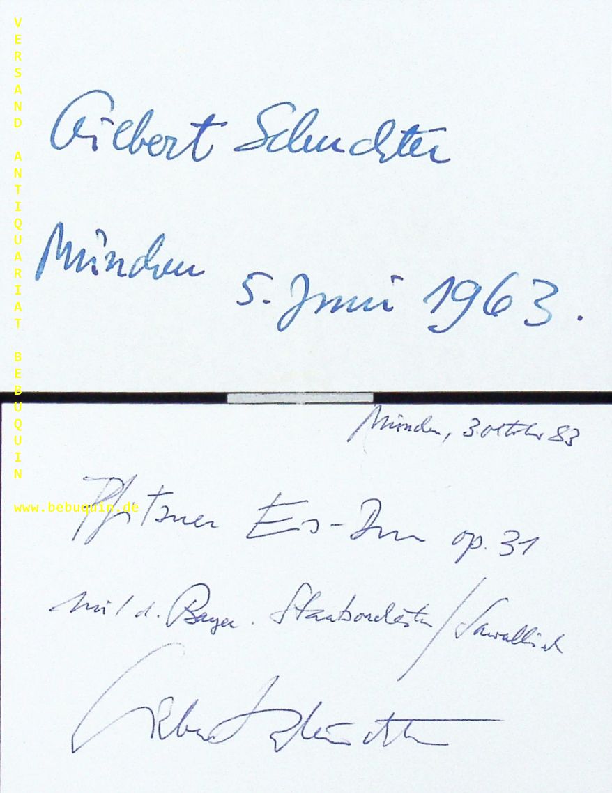 SCHUCHTER, Gilbert (Pianist): 2 eigenhändig signierte und datierte Autogrammkarten. München, 1963 + 1983. 8 x 12,5 cm. 2 Karteikarten. Gilbert Schuchter (* 12. September 1919 in Salzburg; † 18. Juli 1989 ebenda) war ein Salzburger Dirigent, Pianist und Klavierpädagoge. (Wikipedia)