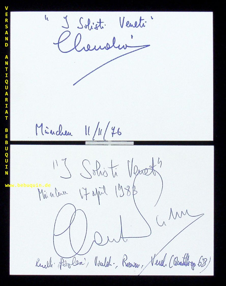 SCIMONE, Claudio (Dirigent): 2 eigenhändig signierte und datierte Autogrammkarte. München (Herkulessaal), 1976 + 1983. 8 x 12,5 2 Karteikarte. Claudio Scimone (* 23. Dezember 1934 in Padua; † 6. September 2018 ebenda) war ein italienischer Dirigent. (Wikipedia)