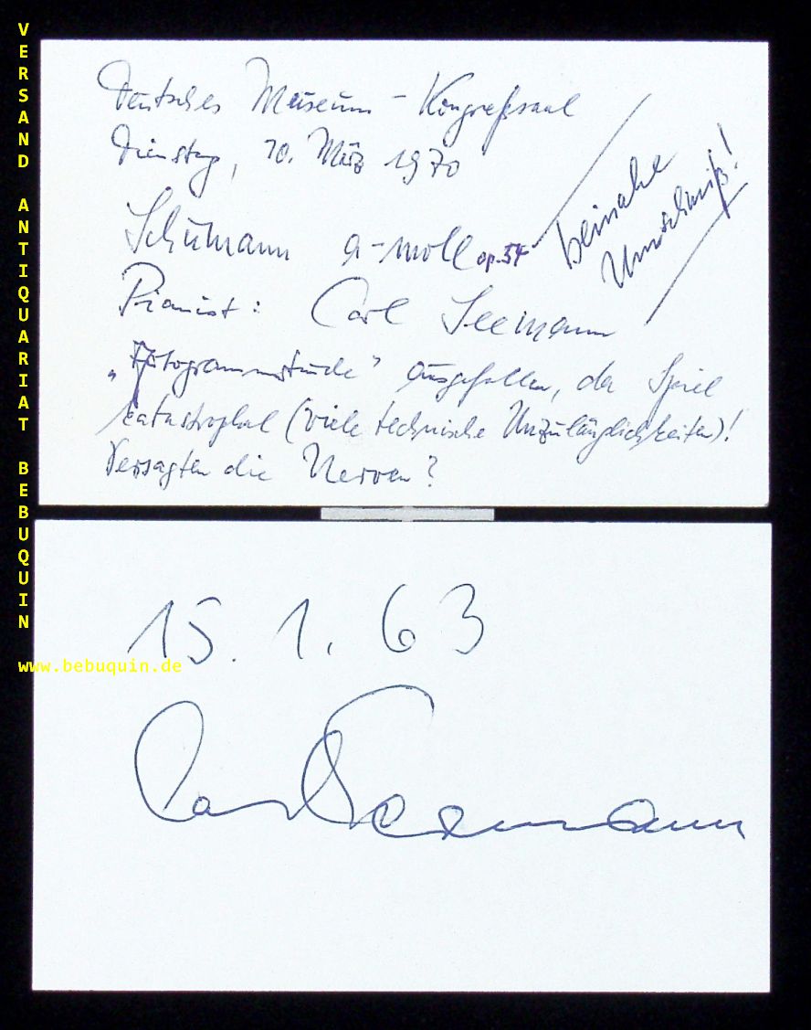 SEEMANN, Carl (Pianist): eigenhändig signierte und datierte Autogrammkarte. München (Herkulessaal), 15.1.1963. 8 x 12,5 Karteikarte. Anbei eine weitere Autogrammkarte von einem Konzert am 10.3.1970: Autogrammstunde ausgefallen, da Spiel katastrophal. Carl Seemann (* 8. Mai 1910 in Bremen; † 26. November 1983 in Freiburg im Breisgau) war ein deutscher Kirchenmusiker, Pianist, Klavierpädagoge und Direktor der Musikhochschule Freiburg. (Wikipedia)