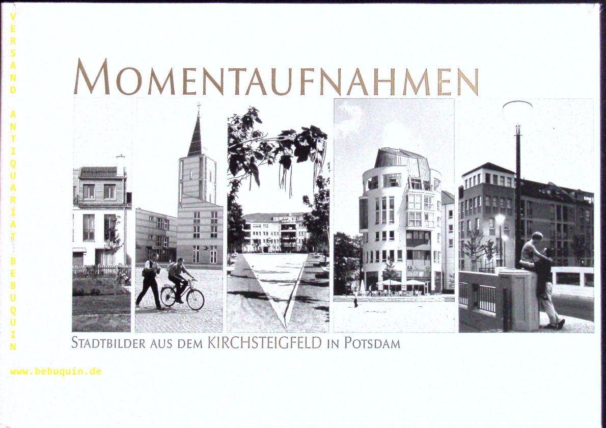 STICHA.– SCHEUNEMANN, Jürgen: Momentaufnahmen. Stadtbilder aus dem Kirchsteigfeld in Potsdam. Berlin (Ed. Sticha), 1999. Quer 4°. 32 Bl. mit zahlr. Bildtafeln von Pavel Sticha. OPb mit OUmschl. EA.