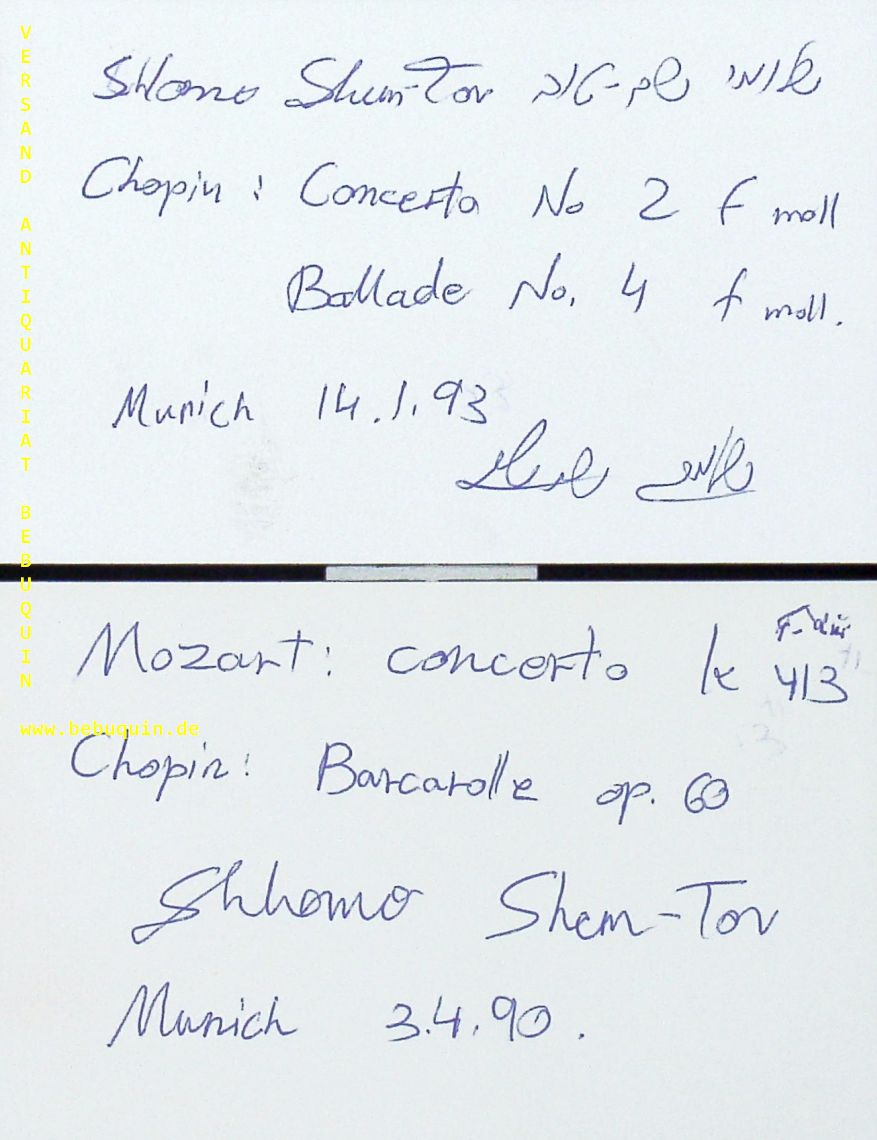 SHEM-TOV, Shlomo (Pianist): 2 eigenhändig signierte und datierte Autogrammkarte. Münchener Debut. München (Philharmonie), 3.4.1990. 8 x 12,5 cm. 2 Karteikarte.