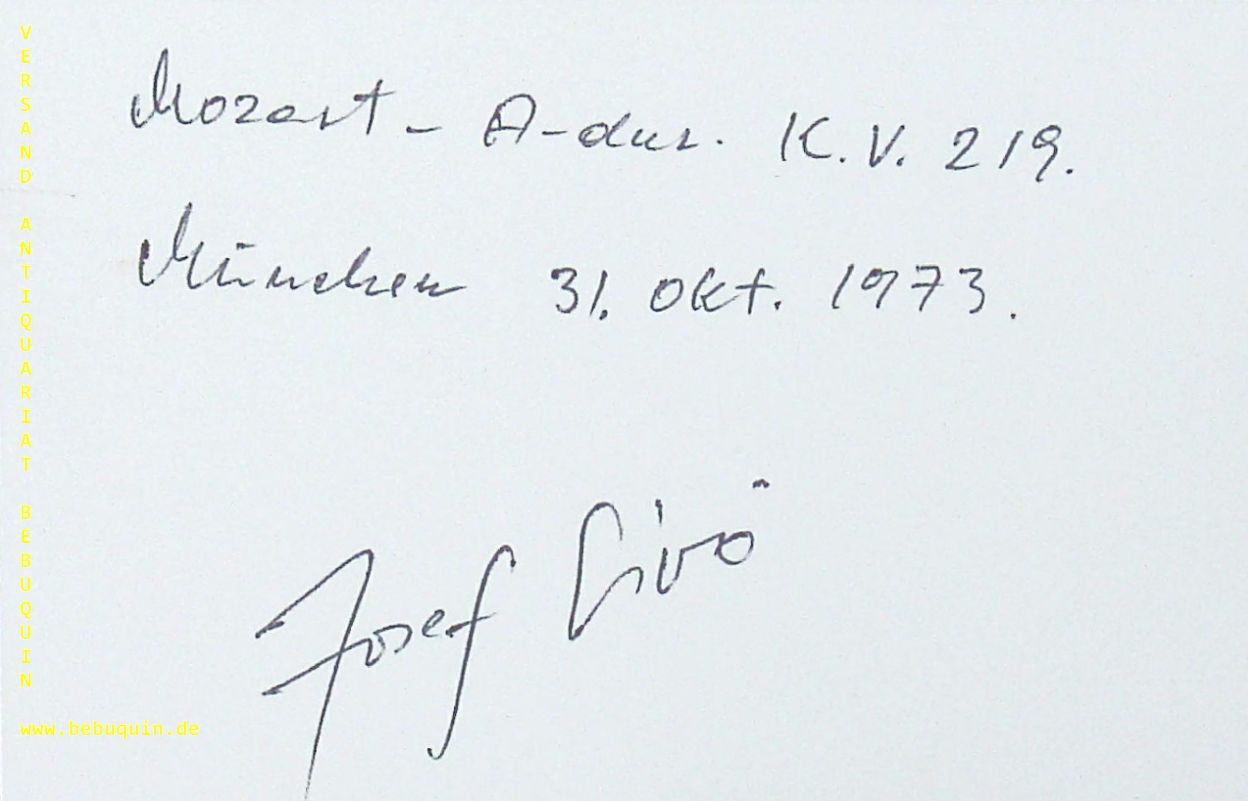 SIVO, Josef (Violinist): eigenhändig datierte und signierte Autogrammkarte. München (Philharmonie), 31.10.1973. 8 x 12,5 cm. Karteikarte. Sivó, Josef (* 26.11.1931 Arad/RO) erhielt seine Ausbildung zunächst bei seinem Vater, dann an der Franz-Liszt-MAkad. Budapest (1956 Diplom). 1956 kam er nach Wien, wo er weiteren Unterricht bei G. Enescu und R. Odnoposoff nahm. 1960–71 war er Mitglied der Wiener Philharmoniker (ab 1964 als Konzertmeister), 1965–67 auch Primgeiger des Musikvereinsquartetts. Als Solist unternahm er Tourneen durch die ganze Welt, Mitwirkung bei den Salzburger Festspielen . (Wikipedia)