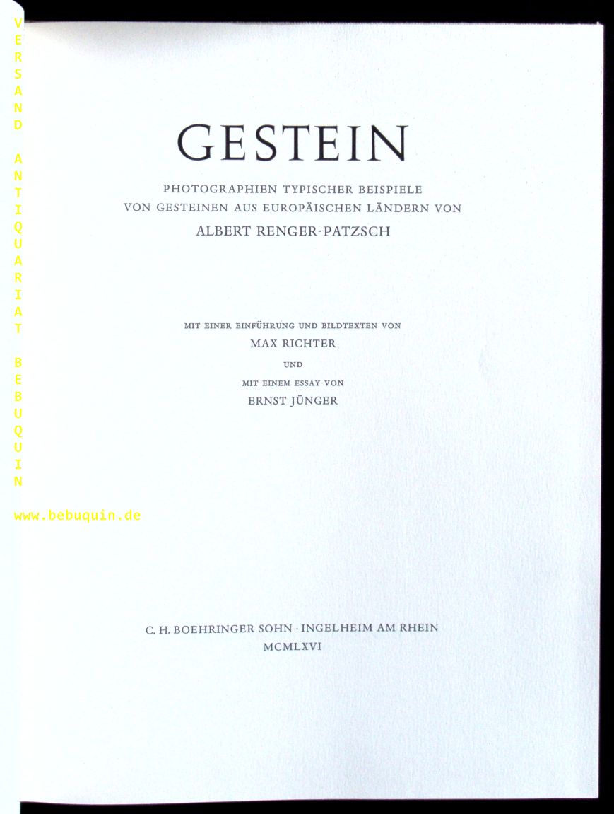 RENGER-PATZSCH, Albert: Gestein. Photographien typischer Beispiele von Gesteinen aus europäischen Ländern. Mit einer Einführung und Bildtexten von Max Richter und mit einem Essay von Ernst Jünger. Ingelheim (Boehringer), (1966). Fol. 18 S. + 62 Bildtafeln. OLn. feines Ex. EA (Jünger) WG² 106.