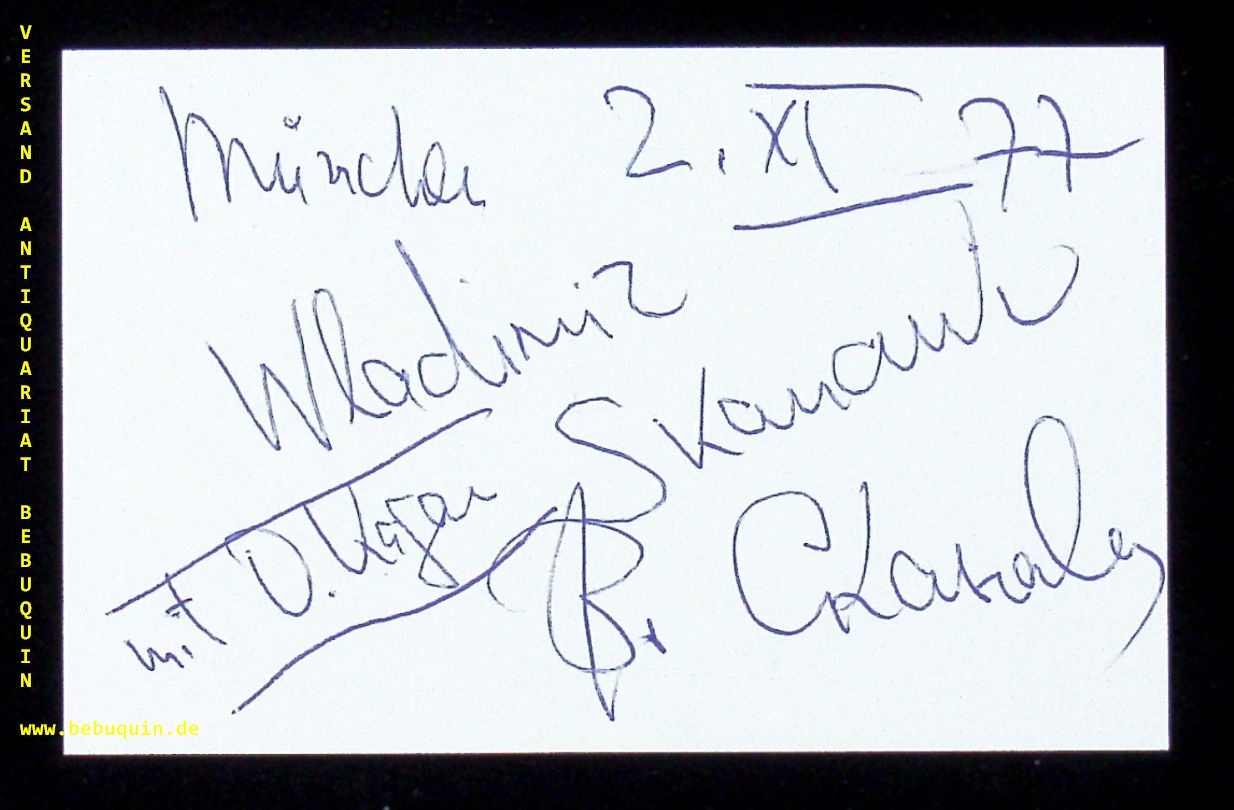 SKANAVI, Vladimir (Pianist): eigenhändig signierte und datierte Autogrammkarte. München (Herkulessaal), 2.11.1977. 8 x 12,5 cm. Karteikarten. . Vladimir Skanavi (b. 1941) is a Russian pianist, Honored Artist of Russia (1999), and a professor at the Moscow Conservatory (since 2001). Since 1965, the pianist had been performing in duos, trios, quintets and other ensembles. Skanavi collaborated with Natalia Gutman, Liana Isakadze, Gidon Kremer, Alexander Rudin, Vladimir Krainev, Elisabeth Leonskaja, Viktor Pikaizen and other distinguished musicians.