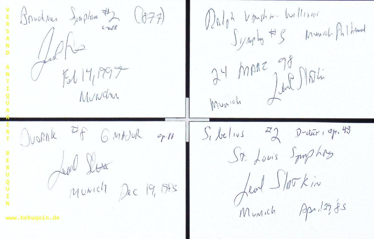 SLATKIN, Leonard (Dirigent): 4 eigenhändig signierte und datierte Autogrammkarten. München (Herkulessaal), 29.4.1985. 8 x 12,5 cm. 4 Karteikarten. Leonard Edward Slatkin (* 1. September 1944 in Los Angeles, Kalifornien) ist ein US-amerikanischer Dirigent. (Wikipedia)