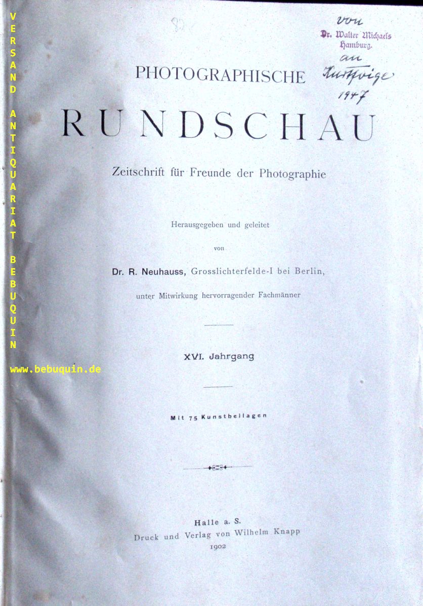 NEUHAUSS, R.: (Hrsg.) Photographische Rundschau. XVI. Jahrgang. Zeitschrift für Freunde der Photographie. Halle (Knapp), 1902. 4°. X, 252 S. mit zahlr. Abb. + 75 Kunstbeilagen mit diversen bedruckten Pergamentseiten. OLn mit goldgeprägtem Rücken. NaT, vereinzelte Marginalien. seltene EA.