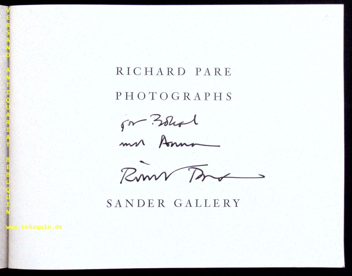 PARE, Richard: Photographs. New York (Meriden / Stinehour), 1986. Quer 4°. 16 S. mit 11 farb. Bildtafeln. OKart. gutes Ex. 1 von 10000 Ex. der EA mit einer eigenhänidgen voll signierten persönlichen Widmung des Fotografen auf Titelseite. SELTEN.