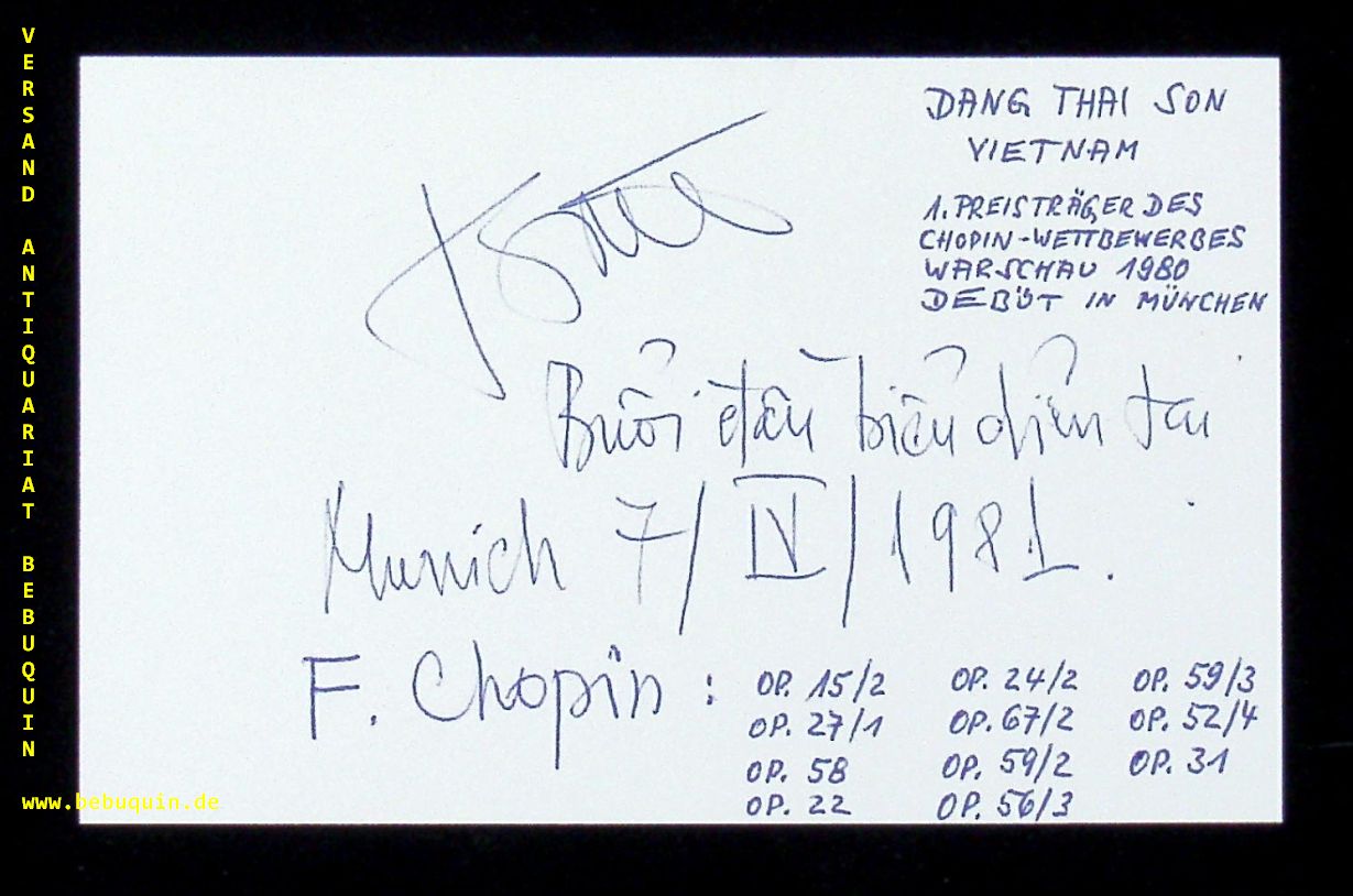 SON, Dang Thai (Pianist): eigenhändig signierte und datierte Autogrammkarte. München, 7.4.1981. 8 x 12,5 cm. Karteikarte. . Ðang Thái Son (* 2. Juli 1958 in Hanoi, Vietnam) ist ein international tätiger Konzertpianist. Er erlangte Bekanntheit, als er im Oktober 1980 im Chopin-Wettbewerb von Warschau den ersten Preis errang. (Wikipedia)