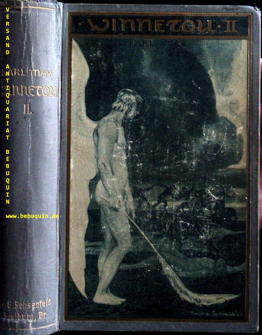 MAY, Karl: Winnetou. II. Band. 51.– 55. Tsd. Freiburg (Fehsenfeld), (1907). 630 (1) S. mit gestalteten Vorsatzpapieren. ill. graues OLn von Sascha Schneider. DB 55. Deckel mit Kratzspuren, Rücken mit leichter Mittelfalte, WaV. = Gesammelte Reiseerzählungen, Bd. VIII.