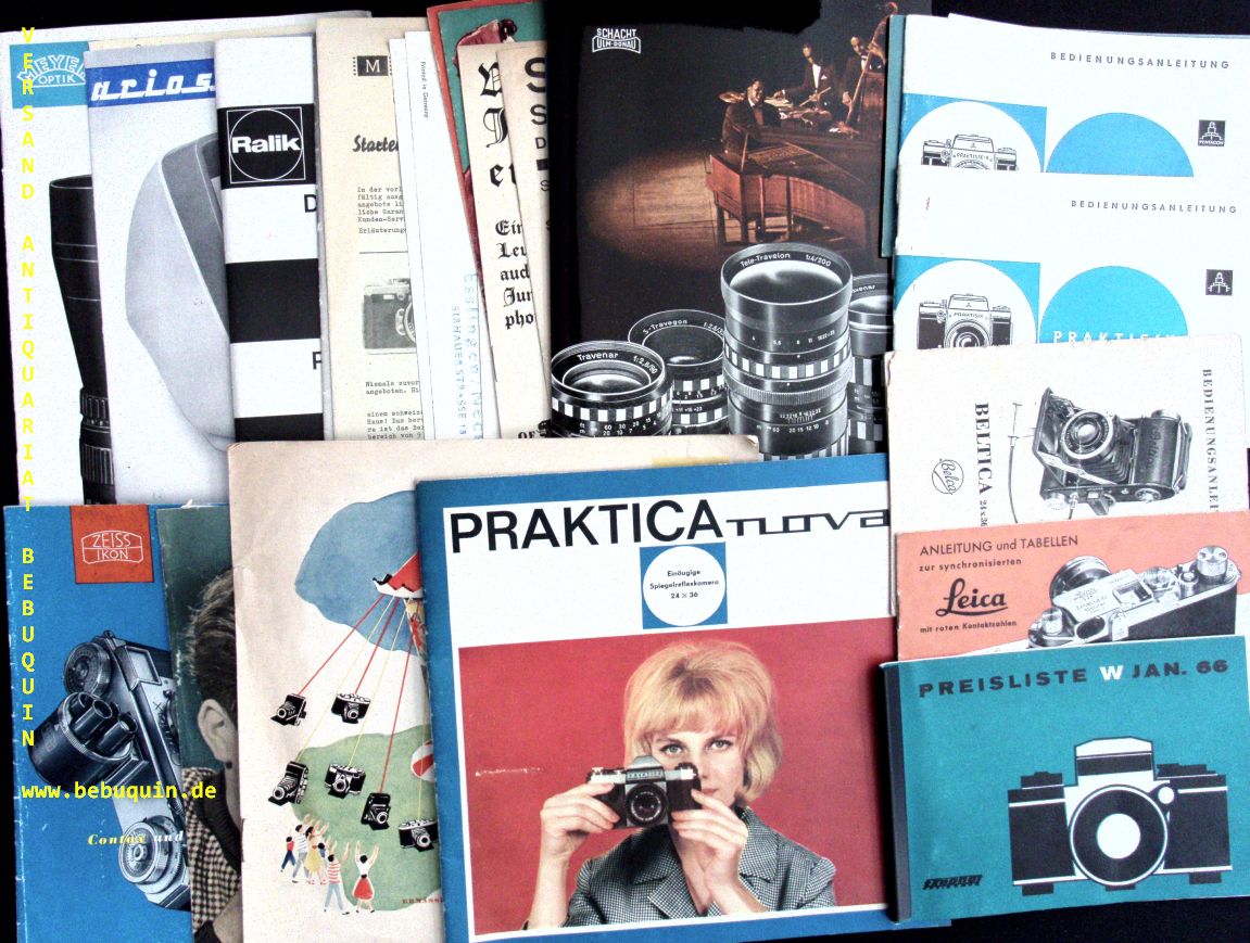 TECHNIK.– KONVOLUT FOTOHEFTE.– über30 Hefte zu verschiedenen Fotoapparaten. Bedieinungsanleitungen, Zubehör etc. zu Praktisix, Beltica, Leica, AK8, Meyer Optik, Exaphot, Ariosa, Ralik, Leitz, Gloriette, Paxette, Schneider Optik, Schacht, Praktica etc. Dresden (Pentacon), 1950 – 1970. unterschiedliche Formate. jeweils zwischen 12 und 100 S. mit teils farb. Bildern. ill. OBr. und OKart. überwiegend gute altersgerechte Erhaltung. Opulente Sammlung.