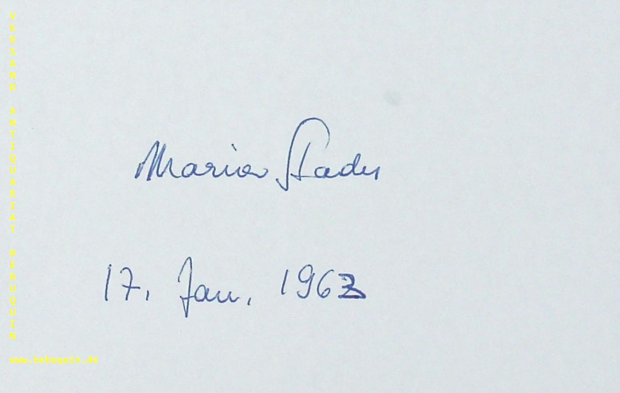 STADER, Maria (Sopran): eigenhändig signierte und datierte Autogrammkarte. München (Philharmonie), 17.1.1963. 8 x 12,5 cm. Karteikarte. Maria Stader (* 5. November 1911 in Budapest, Österreich-Ungarn; † 27. April 1999 in Zürich; geboren als Maria Molnár) war eine Schweizer Opernsängerin (lyrischer Sopran). (Wikipedia)